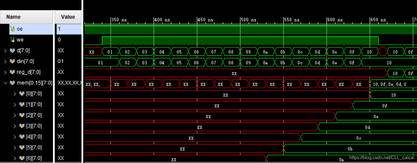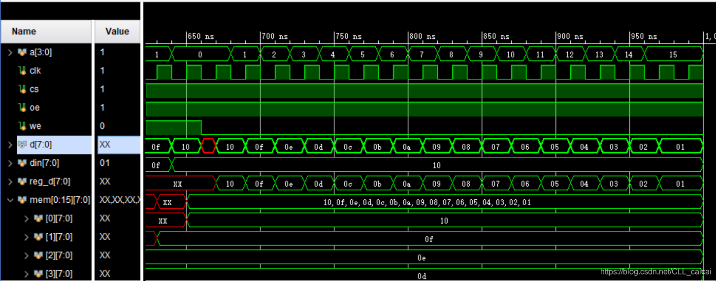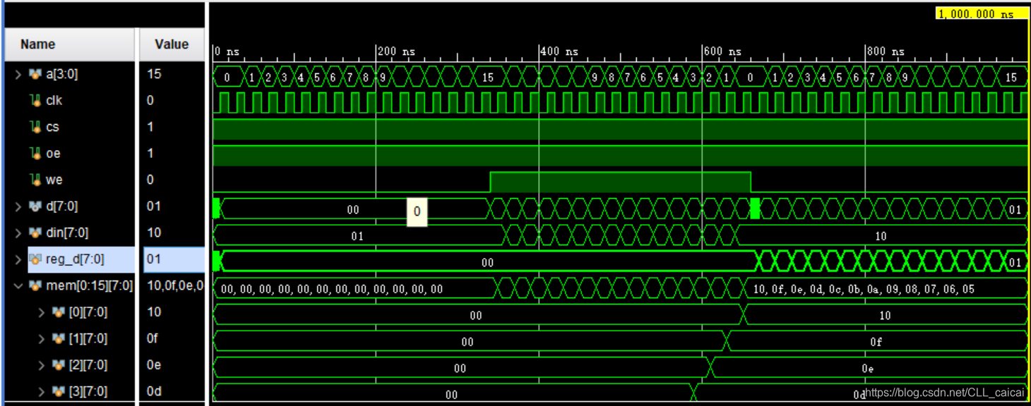 时钟来临时,根据cs/we/oe的值执行不同的操作;cs有效(为1)、we为1时,写使能,将d输入数据写入a对应地址处;cs有效(为1)、we为0时,读使能,oe有效(为1)时将a地址处的数据读出到d上;