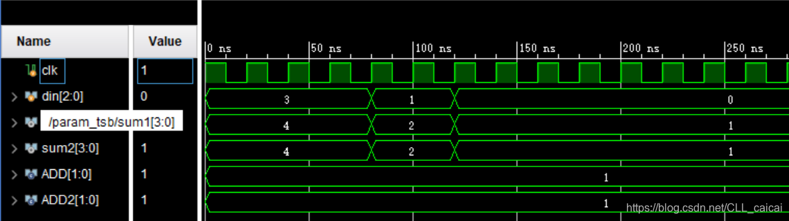 例化3利用defparam传递参数,传递位宽为6;(注意参数赋值与例化时端口赋值一样,可以位置赋值,也可以按照名称赋值;仿真采用名称赋值;也可部分参数赋值,未赋值参数保持默认)