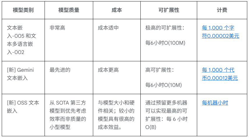 随着 Gemini 和众多 OSS 模型的加入,BigQuery 现已提供全面的文本嵌入选项列表。您可以根据模型质量、成本和可扩展性等需求,选择合适的选项。以下是一些细分信息,可帮助您做出选择。