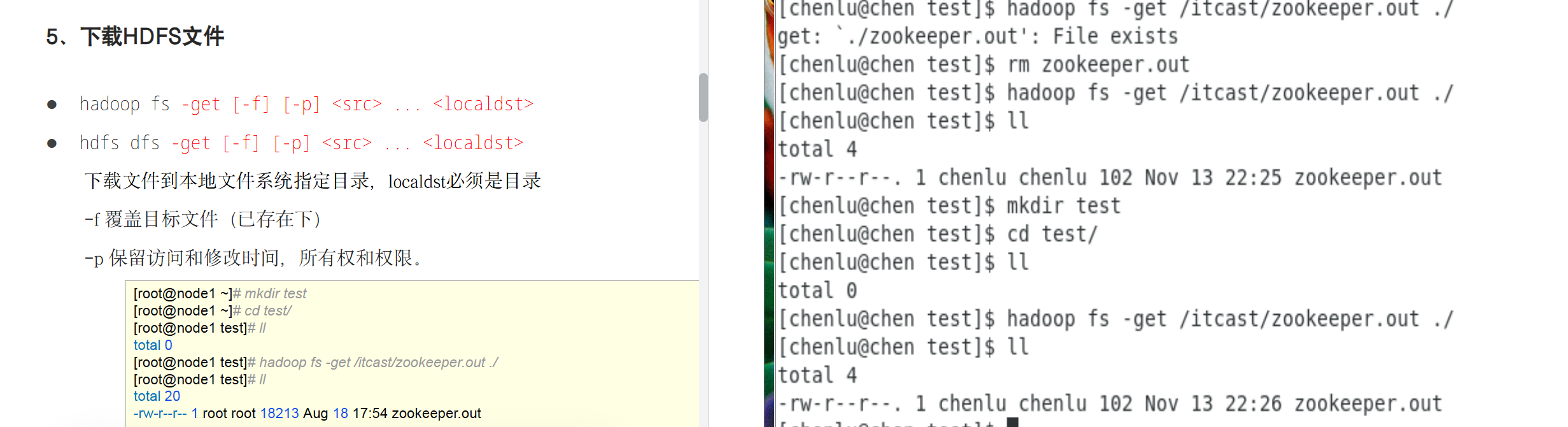 hdfs dfs -get [-f] [-p] <src> ... <localdst>