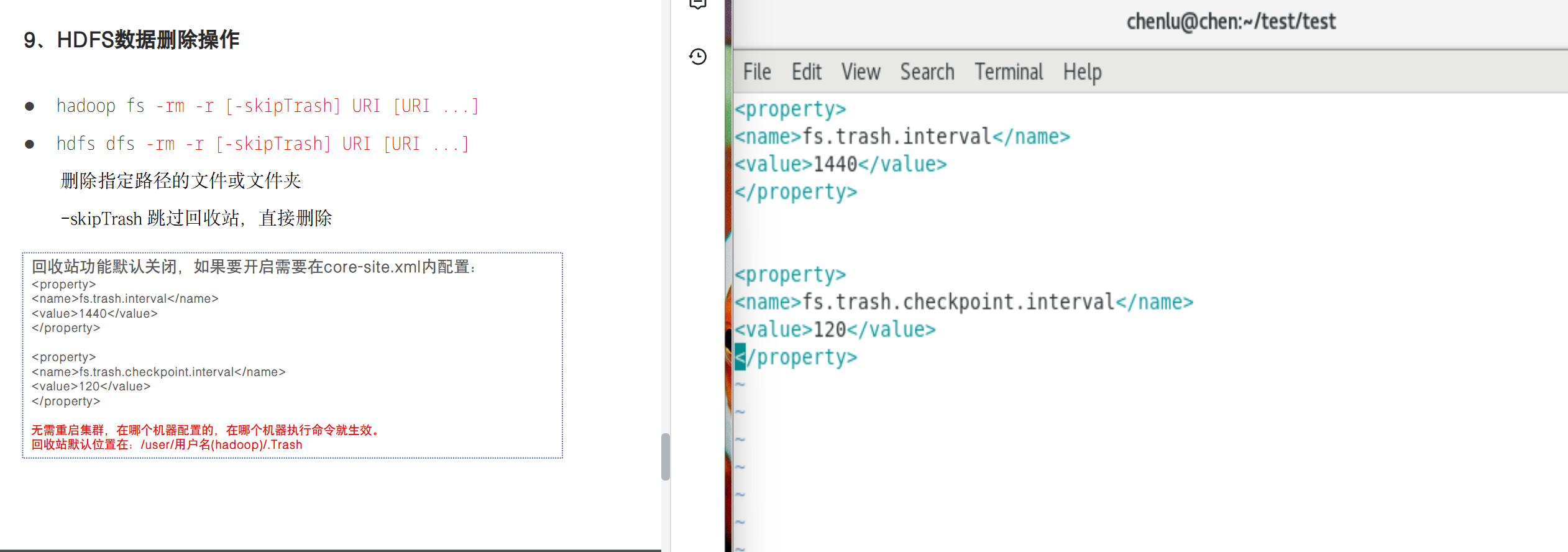 (无需重启集群,在哪个机器配置的,在哪个机器执行命令就生效。回收站默认位置在:/user/用户名(hadoop)/.Trash)