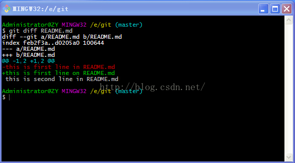 下面就是通过git diff比较的修改前后文件的差异,其中-号代表修改前的内容(红色部分,最后一次git add时候的内容),+号代表修改后的内容(绿色部分,也就是当前内容),没有符号代表该内容未被修改(白色部分)。