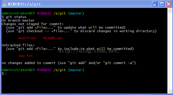 在工作区干净的基础上,修改了已存在的README.md和新增一个new.txt,此时使用git status查看状态如下
