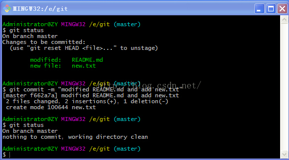 然后分别对README.md和new.txt使用git add,把它们加入到暂存区。然后使用git commit进行提交,此时在查看工作区,干净的哦。多次修改,一次提交,实现。