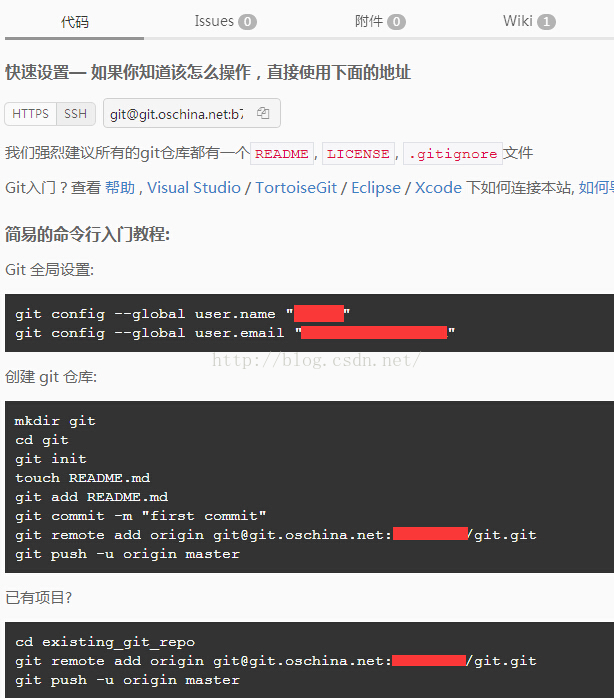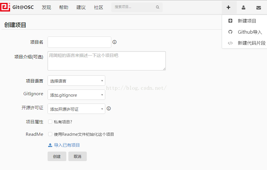 关于在oschina申请账号这里就不再复述了,假定你已经拥有了账号并登录,那么我们就可以建立一个远程仓库了。在oschina上创建一个远程仓库很简单,我们点击新建项目,我们必须要填写的只有项目名,其他的可以根据你的需要进行选择,有一点需要提示的是,如果你已经有git项目想要直接推送到远程仓库,不要让远程仓库初始化,也就是不要勾选“使用Readme文件初始化这个项目”,如果你不想让别人看见你这个项目,勾选“私有项目”。