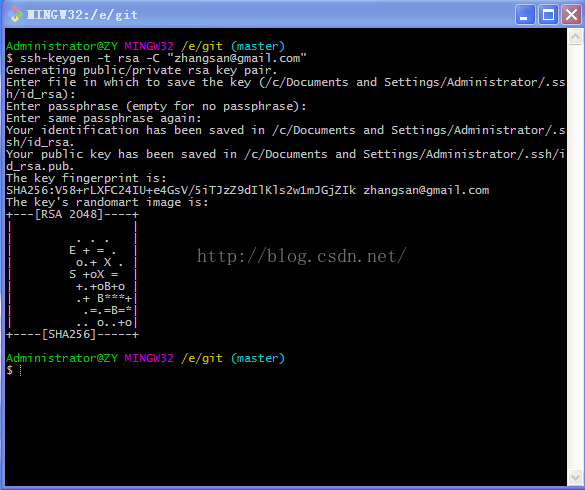 然后一路回车即可。在"C:\Documents and Settings\Administrator\.ssh"中就有我们需要的文件id_rsa.pub。