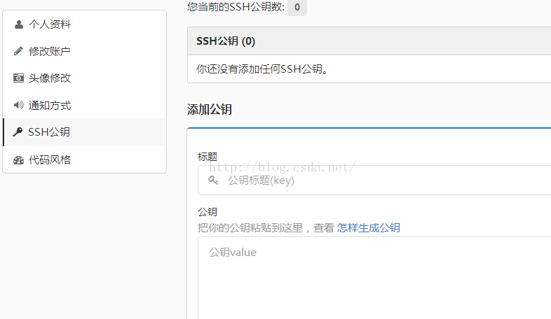 点击这里,前提是你已经登陆了。然后输入个标题,把刚才生成的id_rsa.pub中的内容拷贝一份到公钥处,然后点击确定即可,这样准备工作就已经完成了。