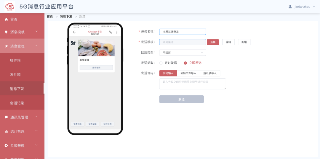 消息下发:输入任务名称、选择模板、输入活选择用户号码后,点击“发送”进行下发。