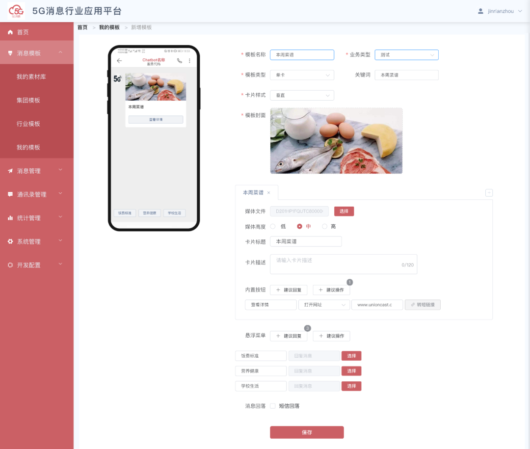 模板编辑:填写模板名称、媒体文件、卡片标题和描述、卡片内置按钮和悬浮按钮等信息;