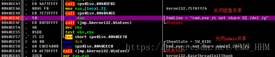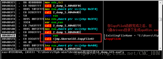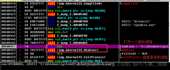 在拷贝文件完成之后,病毒就会利用WinExec来运行指定的应用程序,之后spo0lsc.exe就会被运行起来,原来的进程会被结束。