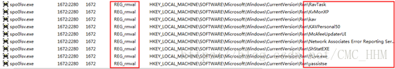 通过火绒剑能观察到病毒每隔一段时间就有检测并且删除杀毒软件在注册表中的自启动选项。