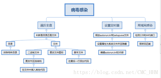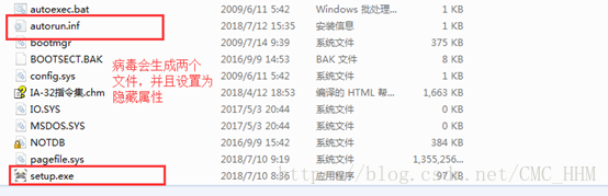 判断每个盘的根目录下是否存在autorun.inf和setup.exe,若不存在,创建autorun.inf文件并且填充内容;复制setup.exe,设置两个文件属性为隐藏。