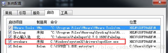 (2)在cmd中输入msconfig打开启动项管理,把svcshare这个启动项关闭