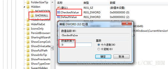 HKLM\Microsoft\Windows\CurrentVersion\Explore/Advanced/Folder\Hidden\SHOWALL\CheckValue