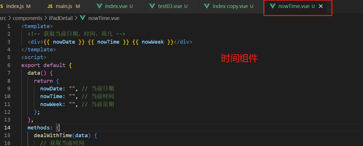 <div>{{ nowDate }} {{ nowTime }} {{ nowWeek }}</div>
