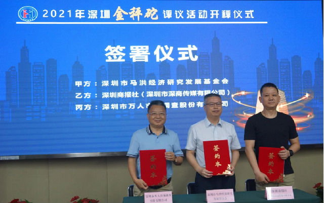 马洪基金会理事长郭万达、深圳商报社经济部主任甘雄、深圳市万人市场调查股份有限公司董事长何明龙先生于活动现场共同签署三方战略合作协议。