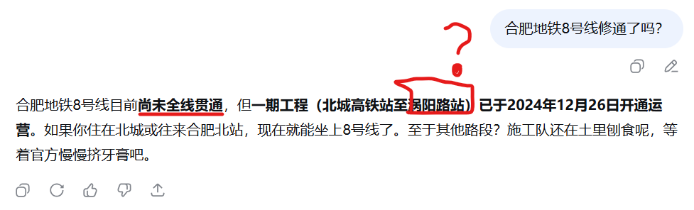 合肥地铁8号线一期工程是北城高铁站到一里井站。说明即使deepseek也会有出错的时候,如果你们不信,再看看这张图(来源于合肥轨道交通官网):
