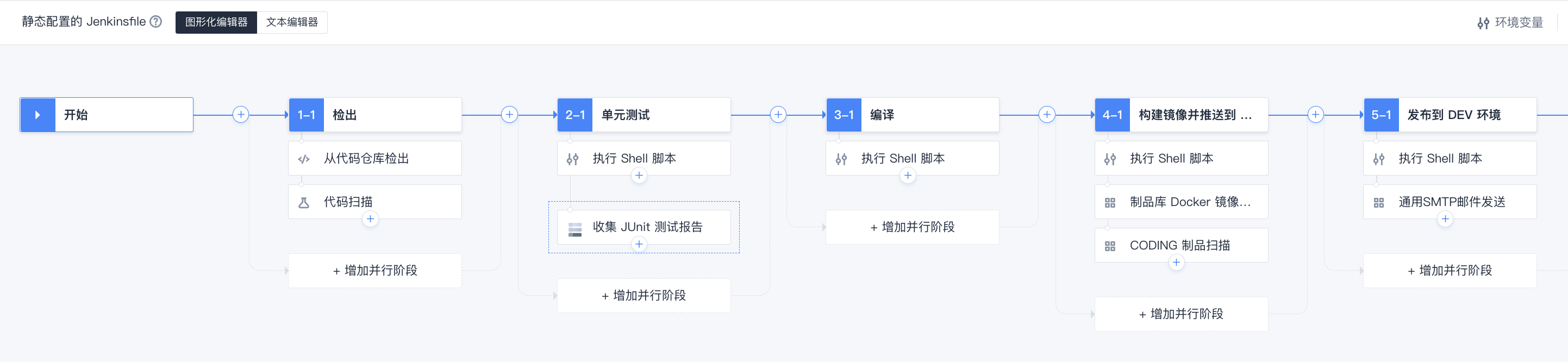 如下图所示,A 银行在 CODING CI 流水线中融合了一系列自动化安全活动。在代码检出时,系统会自动进行代码扫描,随后进行单元测试,在镜像被推送到 CODING 制品库之后,随之进行制品扫描。安全活动层层加持,消除了业务发布之前的绝大部分缺陷与风险。