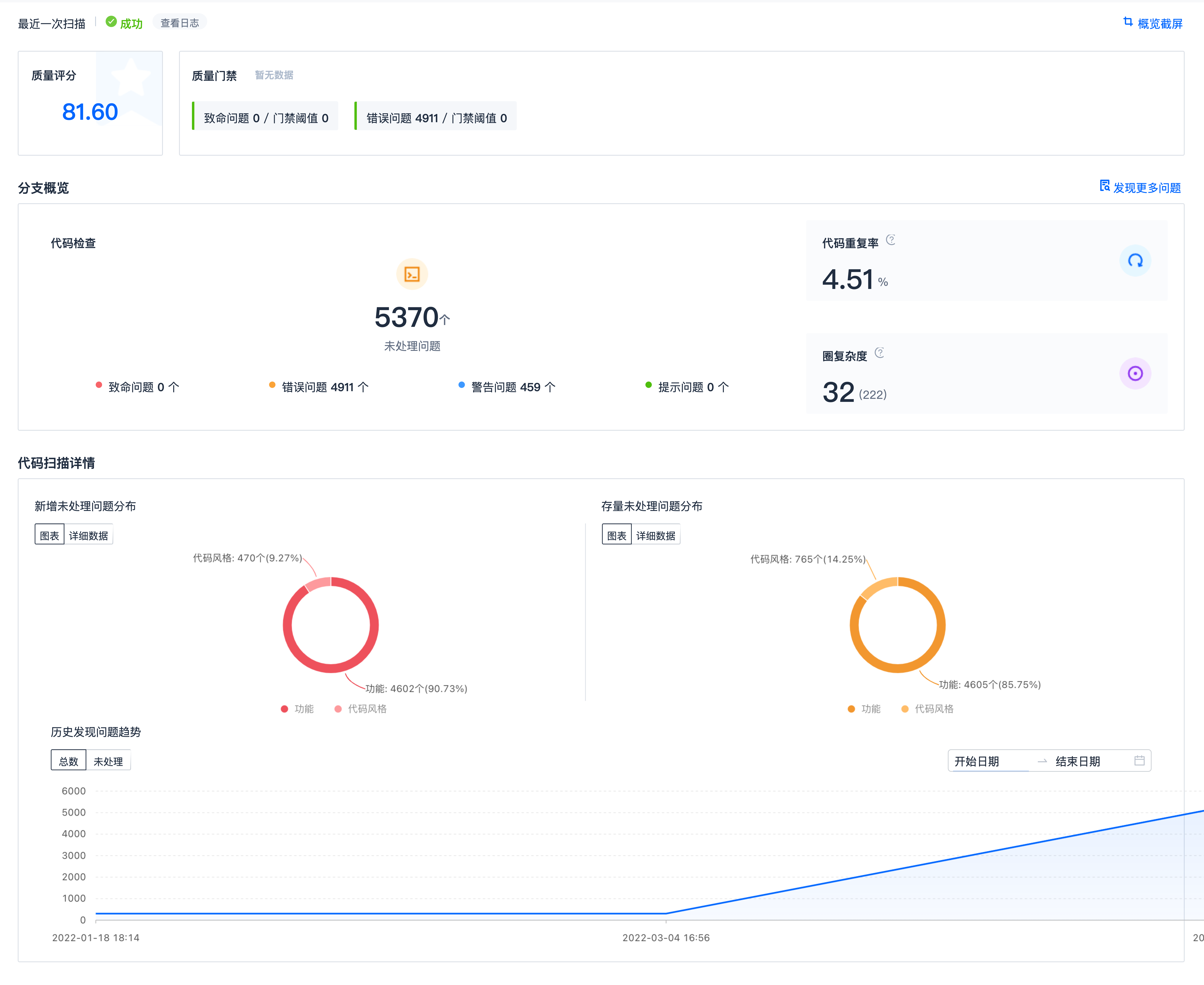 通过问题概览大盘,研发人员可以清晰了解代码问题数量、代码圈复杂度、重复率等情况,极大地帮助 A 银行及时发现潜藏代码缺陷、安全漏洞以及不规范代码,提升代码的可维护性和稳定性。