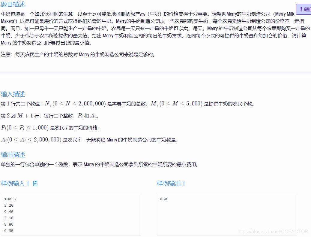 将所有农民的牛奶价格和牛奶数量放入一个对或做成结构体,然后快排,先按价格从低到高排序,价格相同则按拥有牛奶的数量从高到低排序。从排最前的开始选,买完该农民的全部牛奶之后就买下一农民的牛奶,一直到数量不少于 n 。