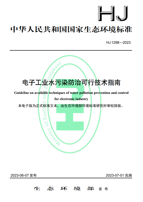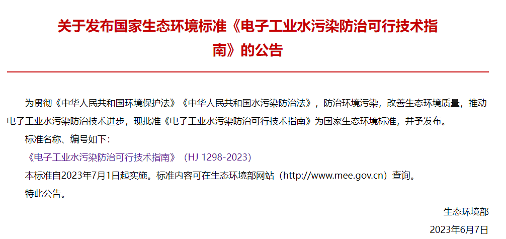 近日,生态环境部对外正式发布国家生态环境标准《电子工业水污染防治可行技术指南》,自2023年7月1日起实施。