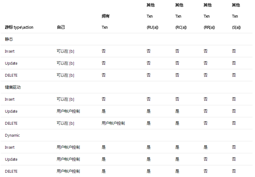 [a] 中括号的字母指示包含游标的事务的隔离级别(在其中进行了更改) 的其他事务的隔离级别是不相关。