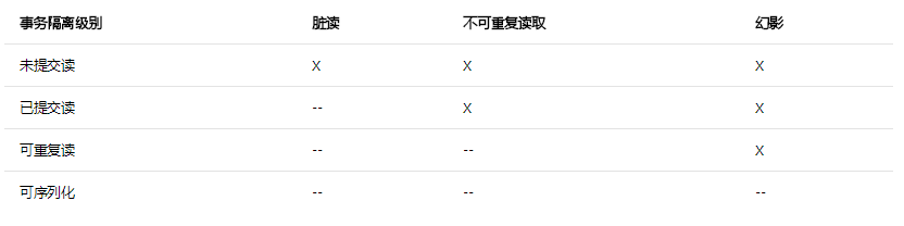 根据这些现象定义四个事务隔离级别 (如 SQL-92 所定义)。 下表中"X"将标记每个可能发生的现象。