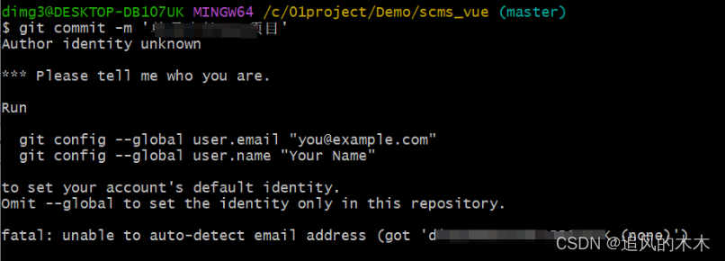- 将暂存区的文件提交至仓库中:git commit -m '本次的提交信息';此处若提示如下信息