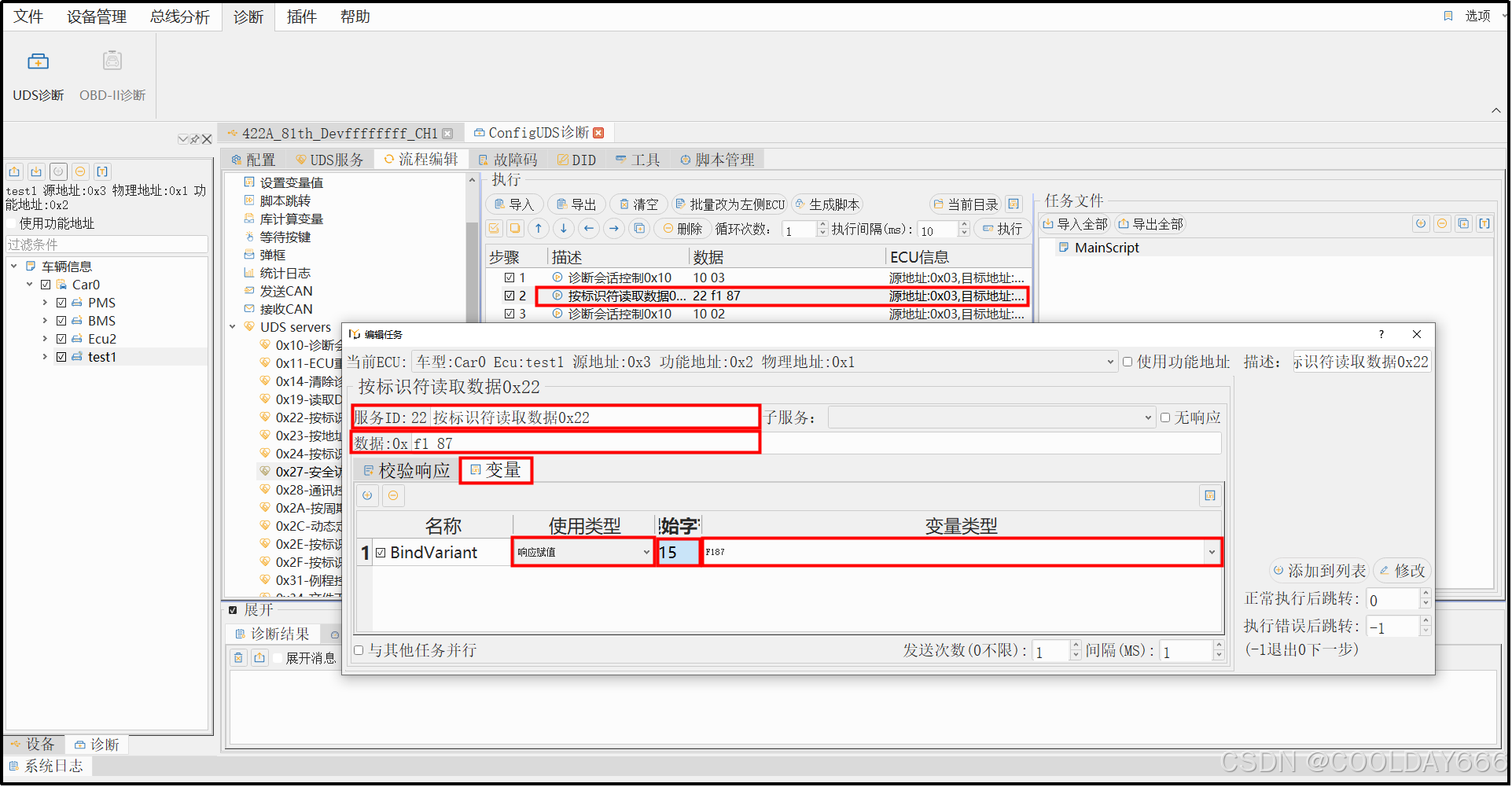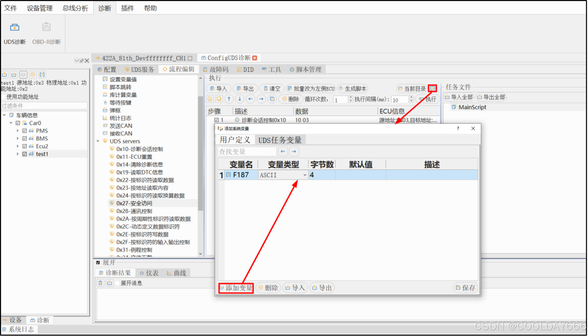 2.添加22 F1 87指令读取ECU备件号,功能就是获取F187的后4个字节数据,将其赋值给变量F187,作为安全算法计算Key值的条件。