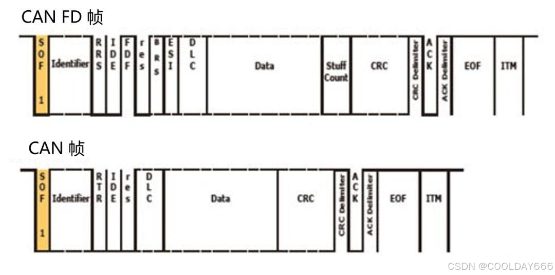 - CANFD帧中新增了FDF,BRS和ESI位:FDF(Flexible Data Rate Format)位为灵活数据格式位,用来区分CAN帧和CANFD帧,该位在CANFD帧中常为隐形(1)。BRS(Bit Rate Switch)位为位速率转换位,当BRS位为显性(0)位时,数据段的位速率和仲裁段的位速率一致(恒定速率);当BRS位为隐形位(1)时,数据段能够以高于仲裁段的位速率传输(从BRS位到CRC可以使用较高的速率传输)ESI(Error State Indicator)位为错误状态指示位,当ESI位为显性(0)时,表示节点处于主动错误状态;当ESI位为隐性(1)时,标识节点处于被动错误状态。