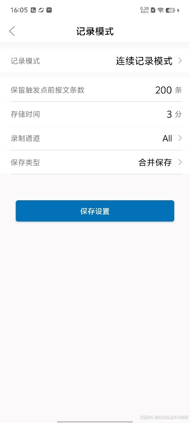 - 如上图选择的配置为连续记录模式、保留触发点前报文条数200条、存储时间3min、所有的录制通道、合并保存类型,最后点击保存设置即可完成记录模式的配置。