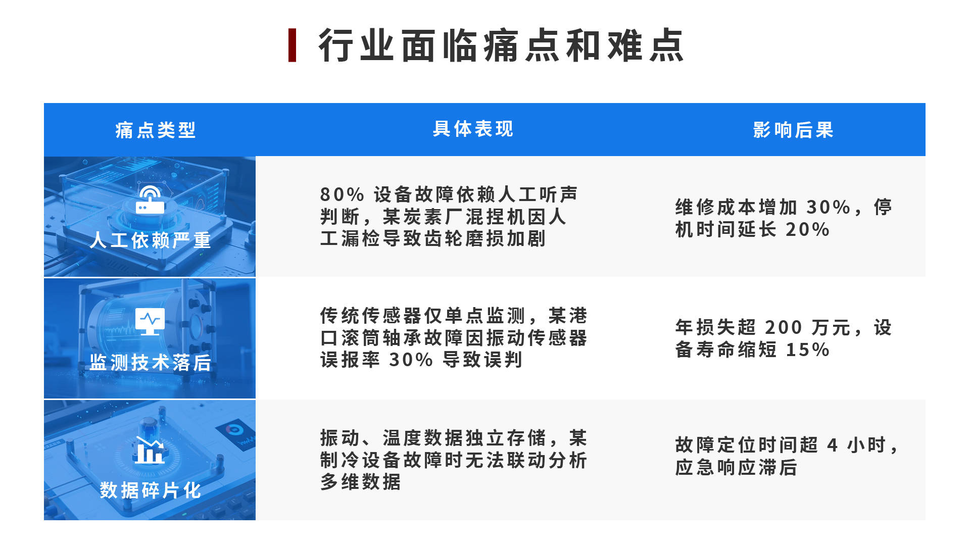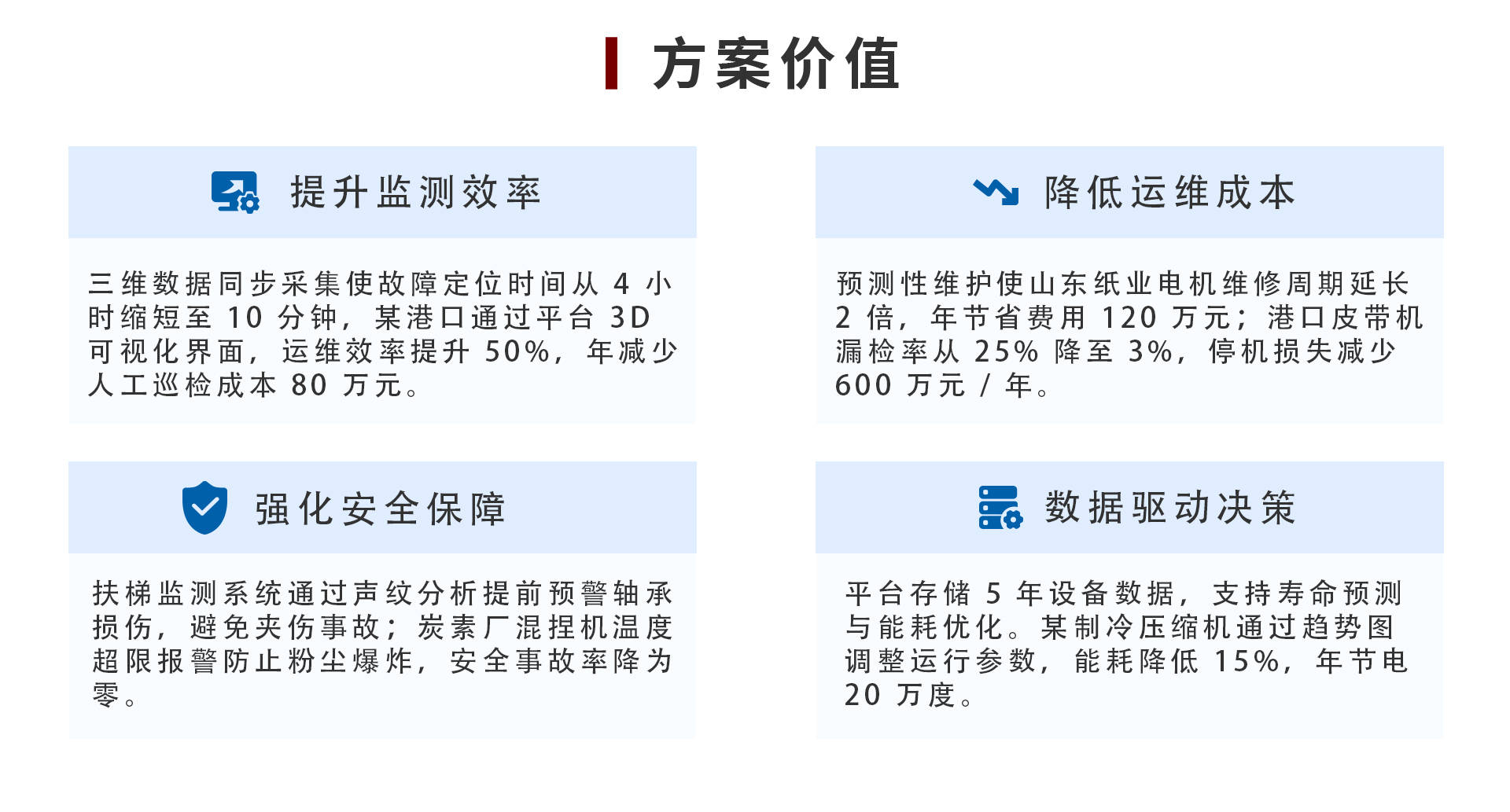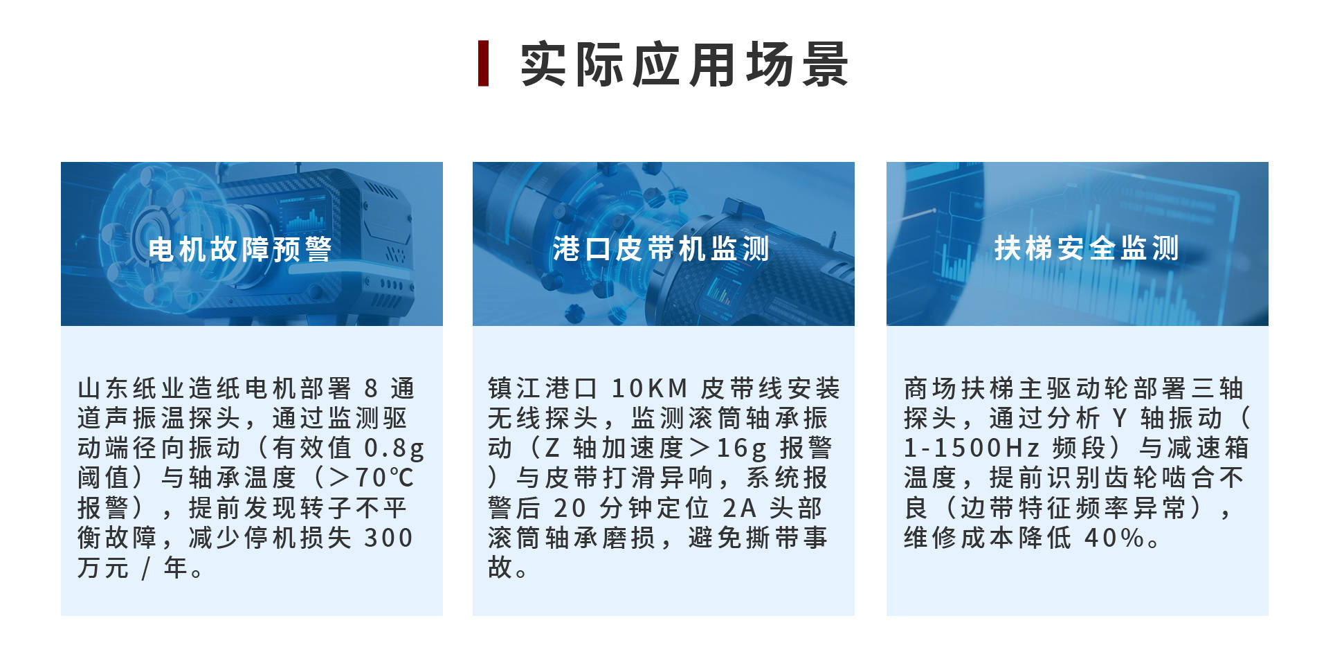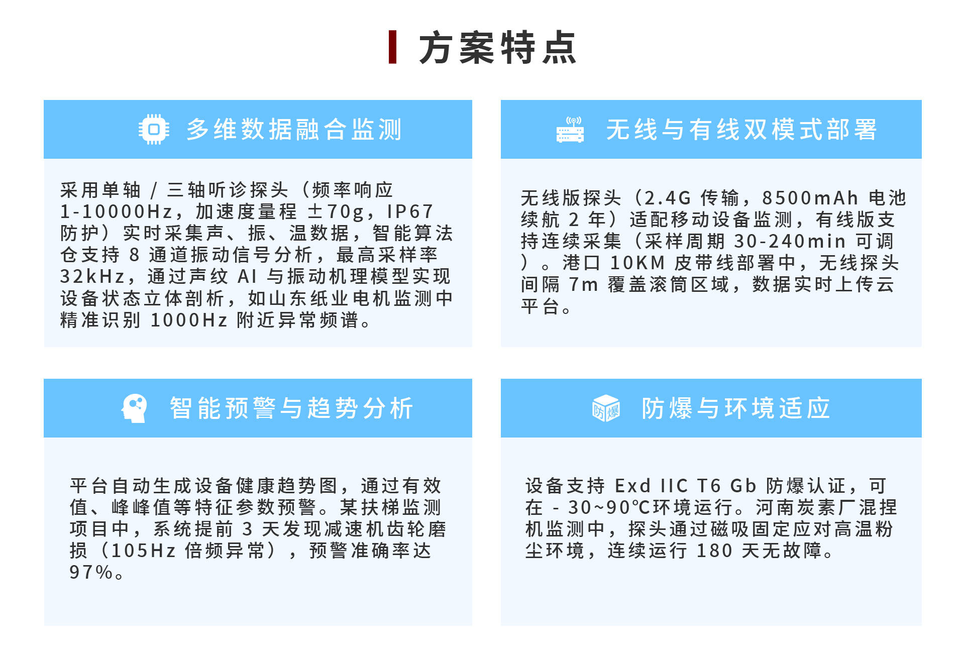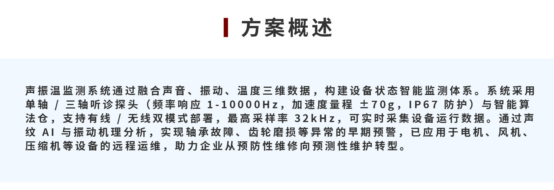 中设智控声振温监测系统通过融合声音、振动、温度三维数据,构建设备状态智能监测体系。系统采用单轴 / 三轴听诊探头(频率响应 1-10000Hz,加速度量程 ±70g,IP67 防护)与智能算法仓,支持有线 / 无线双模式部署,最高采样率 32kHz,可实时采集设备运行数据。通过声纹 AI 与振动机理分析,实现轴承故障、齿轮磨损等异常的早期预警,已应用于电机、风机、压缩机等设备的远程运维,助力企业从预防性维修向预测性维护转型。