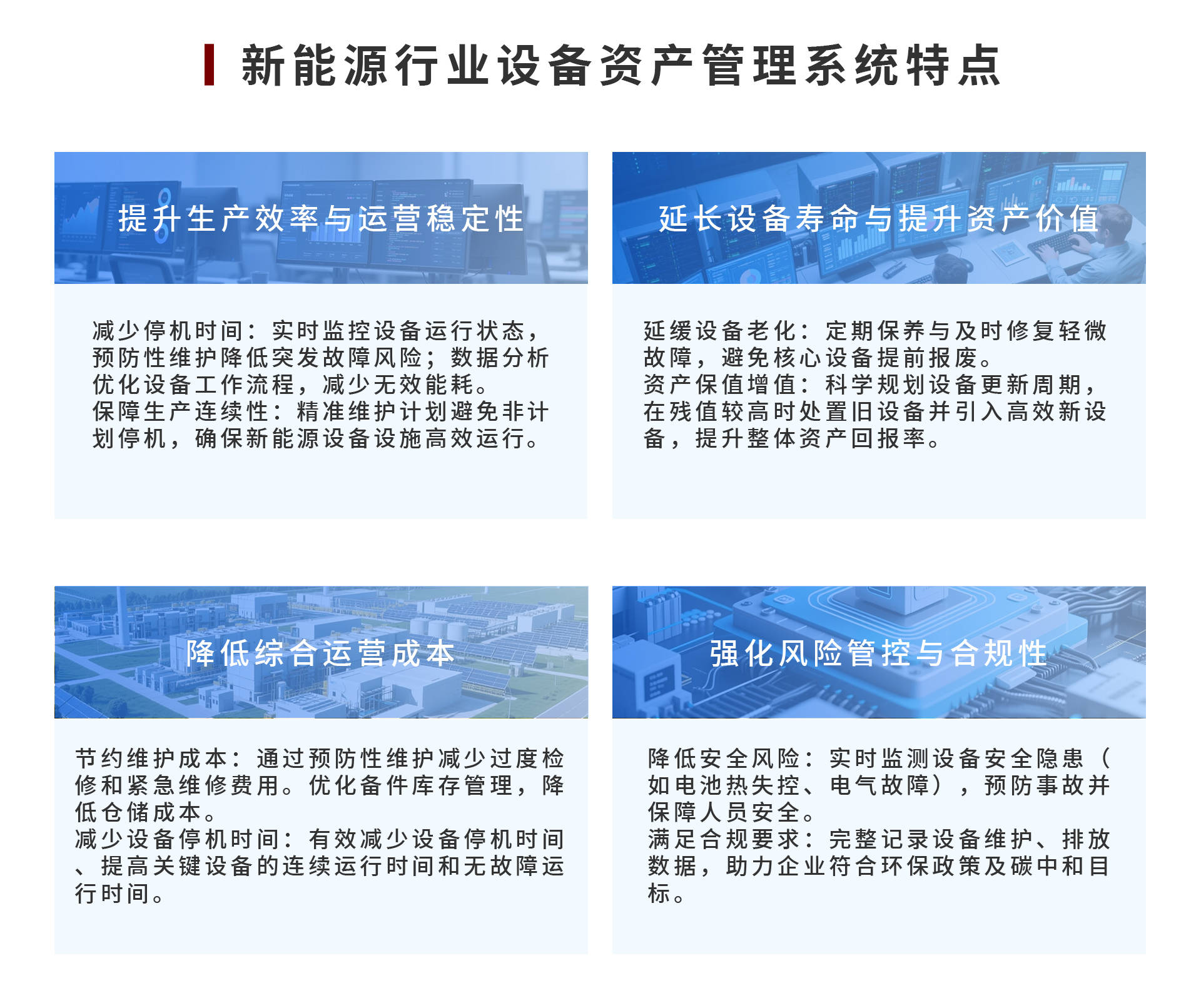 在 “双碳” 目标驱动下,新能源设备资产管理正迎来变革机遇。数智化手段不仅是企业提质增效的关键,更是推动能源行业高质量发展的必由之路。随着技术创新与实践深化,新能源设备资产管理将迈向更智能、高效、绿色的新境界。