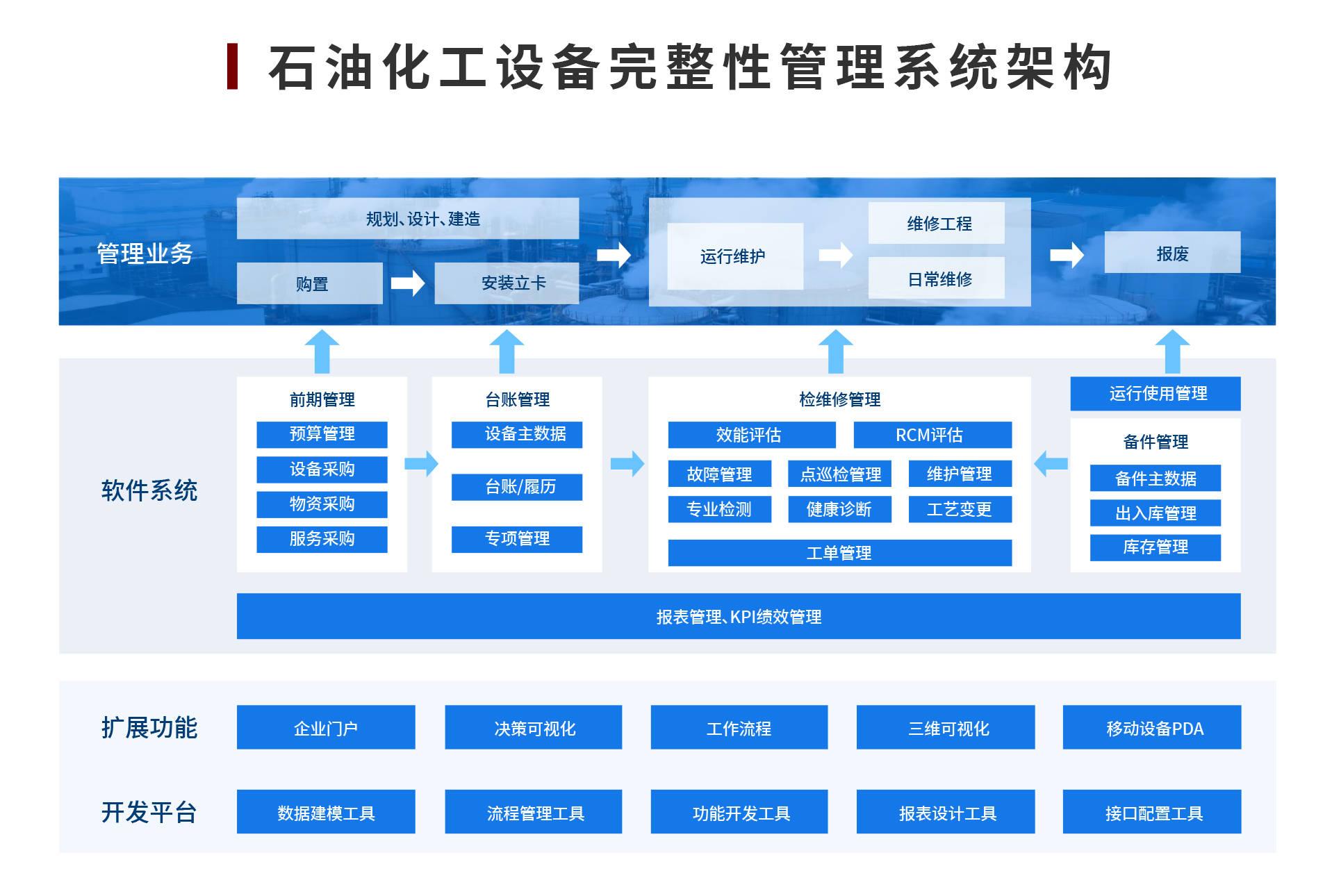 石油化工行业(石油行业/化工行业/石化行业)设备资产管理因安全要求高、设备种类多且分布广、响应时间短,存在权属模糊、运维保障难、备件管控复杂等痛点,安全监管与绩效评价也面临挑战。中设智控融合数字化技术,构建设备完整性管理方案,以数据采集、风险评价等为路径,打造覆盖设备全生命周期的系统架构,具备全周期管控、完整性管理等功能,可提升设备效率与可靠性,已在多个大型央国企石化企业落地,助力行业降风险、提效能,保障生产安全与可持续发展 。
