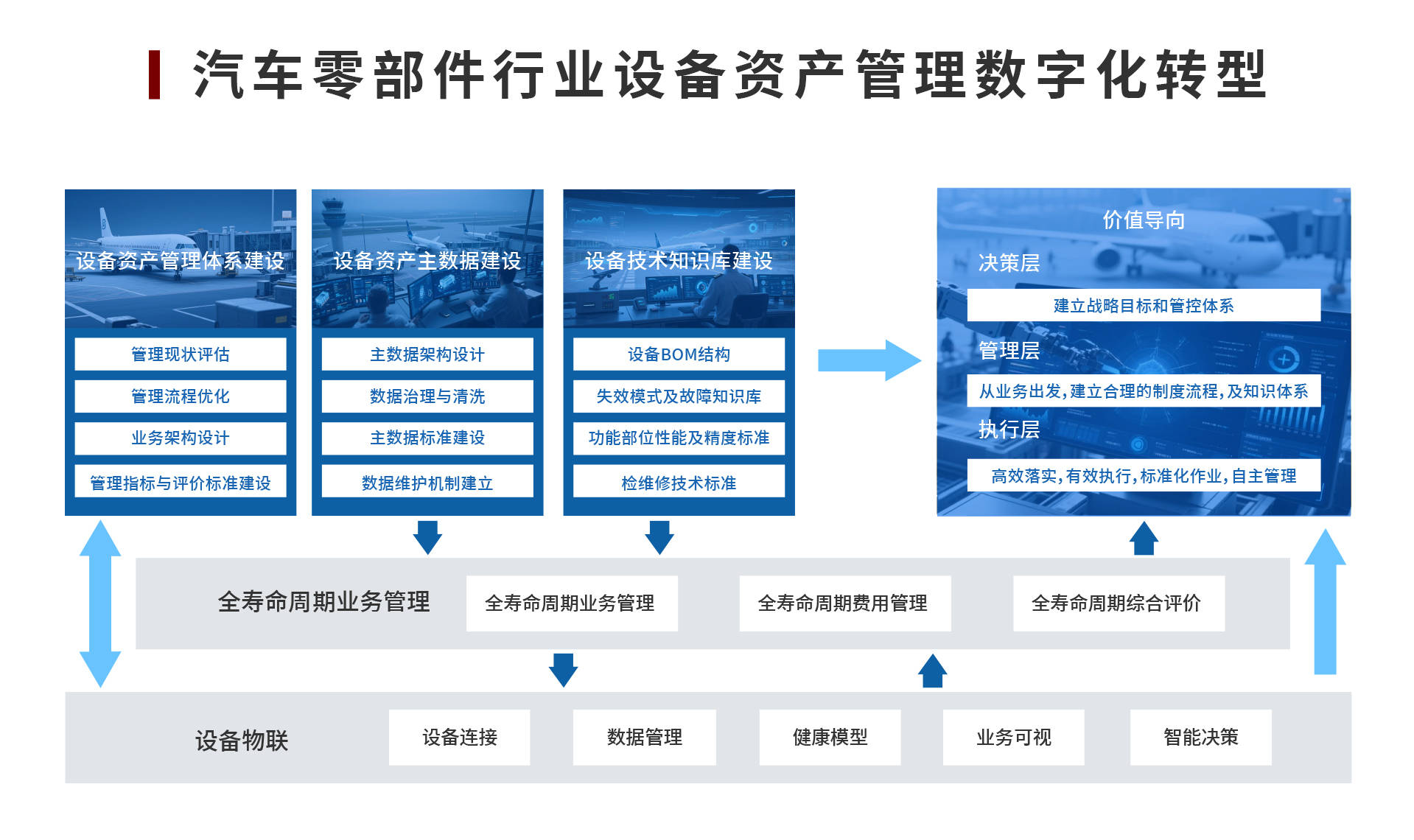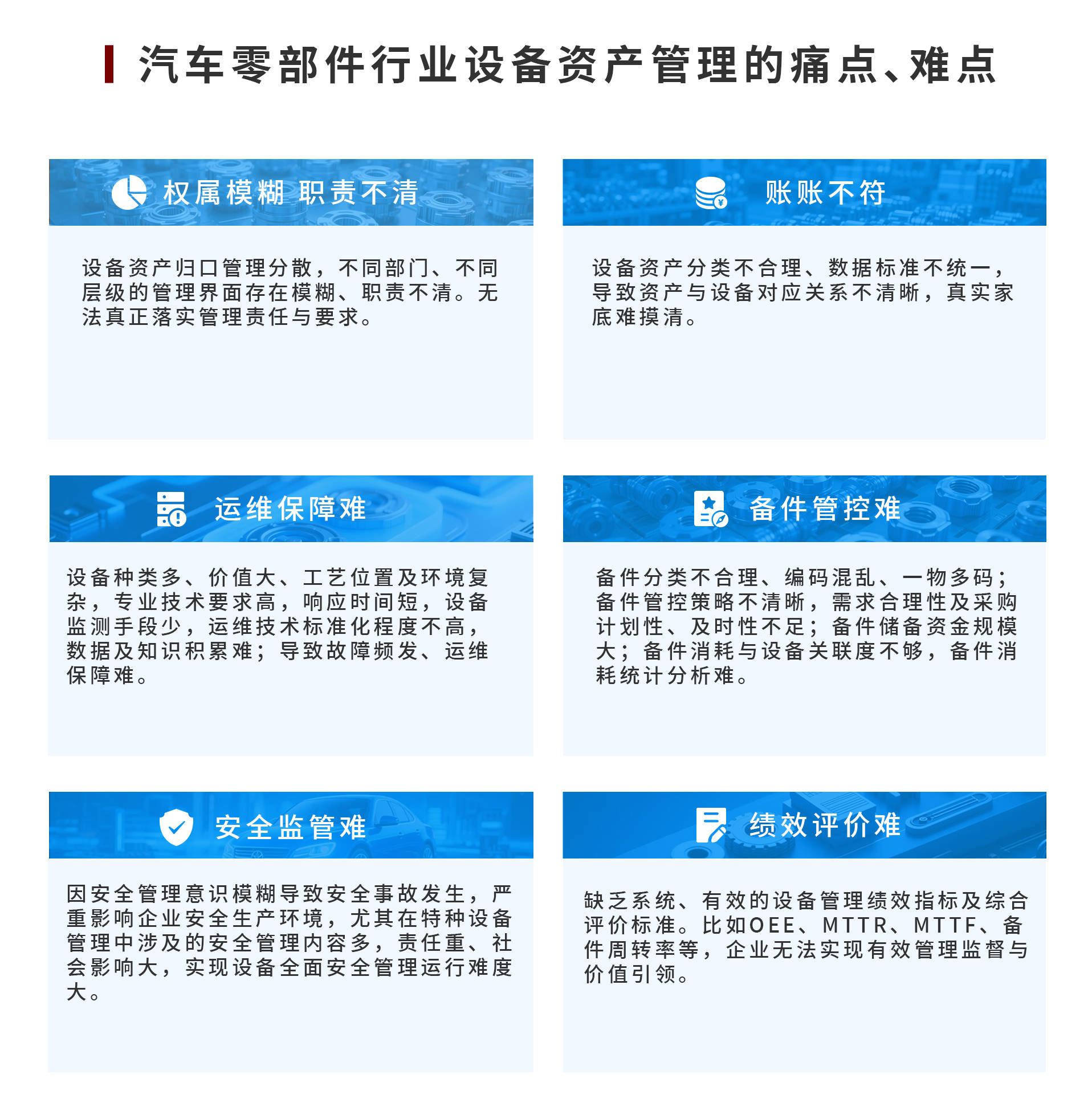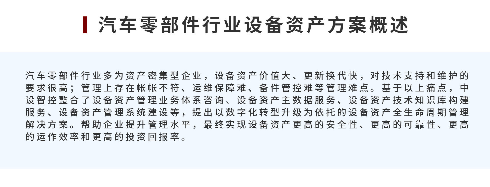 汽车零部件行业多为资产密集型企业,设备价值大、迭代快,却面临权属模糊、账账不符、运维保障难、备件管控复杂等痛点,安全监管与绩效评价也存在挑战。中设智控整合设备资产管理业务体系咨询、主数据服务及知识库构建等,打造数字化全生命周期管理方案。方案通过构建管理体系、主数据及技术知识库,实现设备物联、数据管理与智能决策,具备全周期业务管控、备件精准管理等功能,已在上海博泽、法雷奥等企业落地,助力企业提升设备安全性、可靠性与运作效率,优化管理成本,驱动行业数字化转型与高质量发展 。