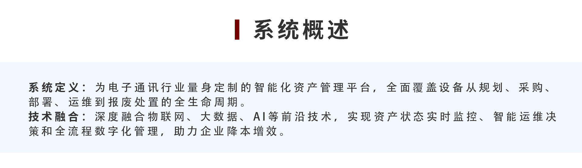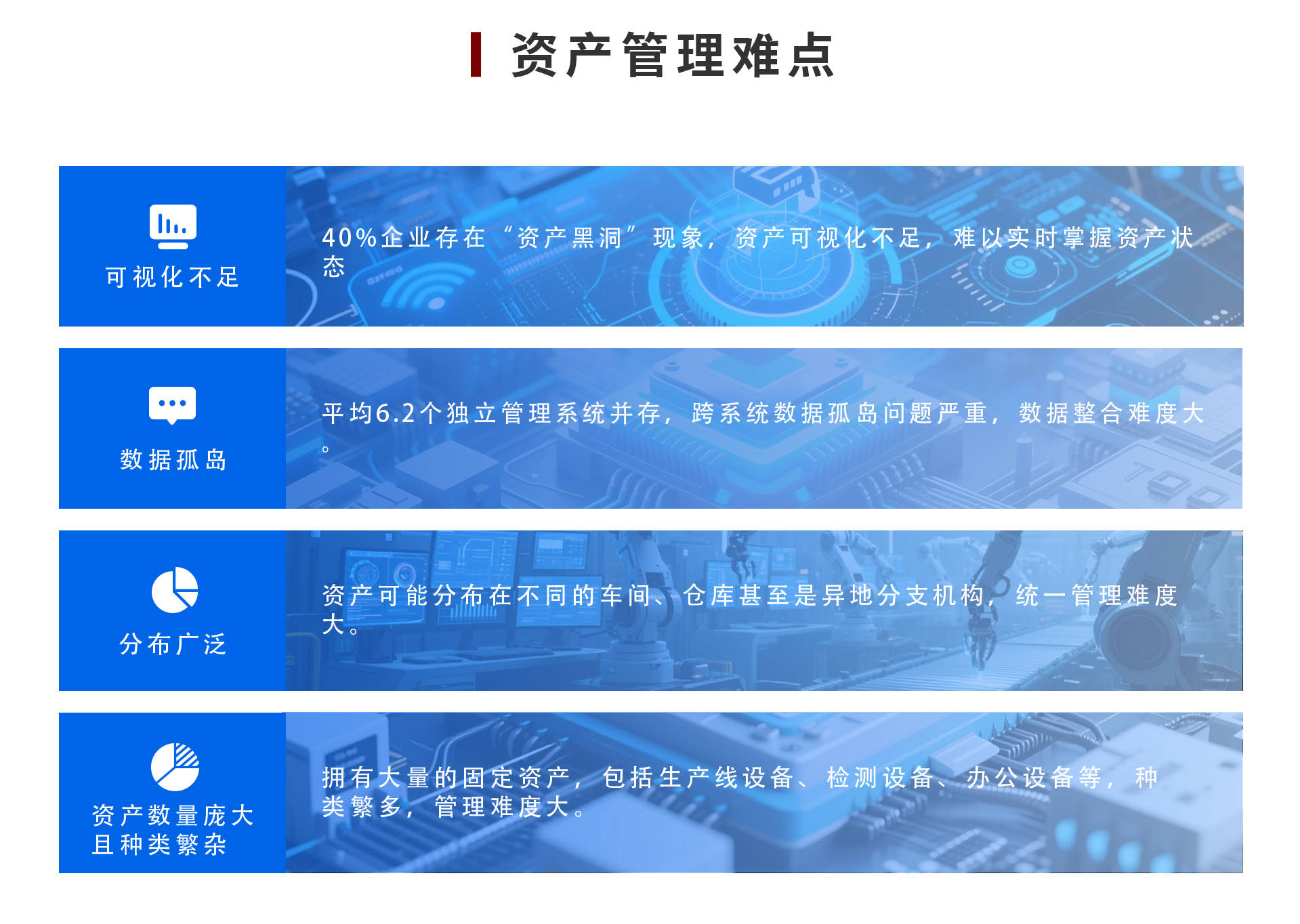 电子通讯行业资产管理因技术应用广、全球布局复杂、资产类型多样,存在可视化不足(40%企业有“资产黑洞”)、数据孤岛(平均6.2个独立系统并存)、分布广泛及数量品类繁杂等难点。中设智控深度融合物联网、大数据、AI技术,打造覆盖设备规划、采购到报废全周期的智能化管理平台。方案构建资产管理体系、主数据及技术知识库,通过设备物联、数据管理等实现全流程数字化,具备自动化工单派发、IOT远程监测、AI预测性维护等功能,可提升运维响应速度60%、资产利用率25%-40%,方案已在电子通讯行业多个大型企业落地,助力行业构建数字化运营能力、形成数据资产,高效应对管理挑战,驱动降本增效与竞争力提升 。