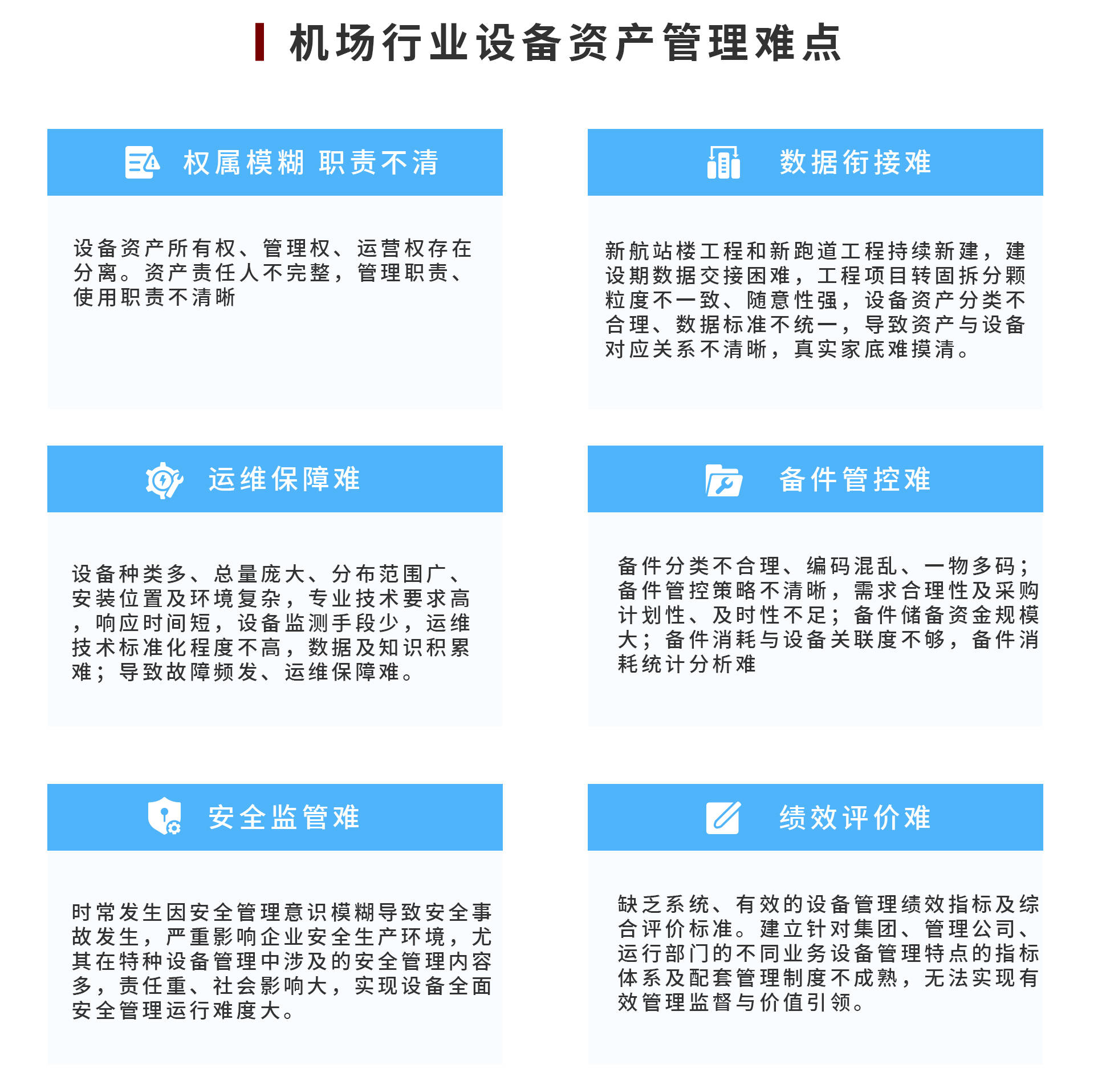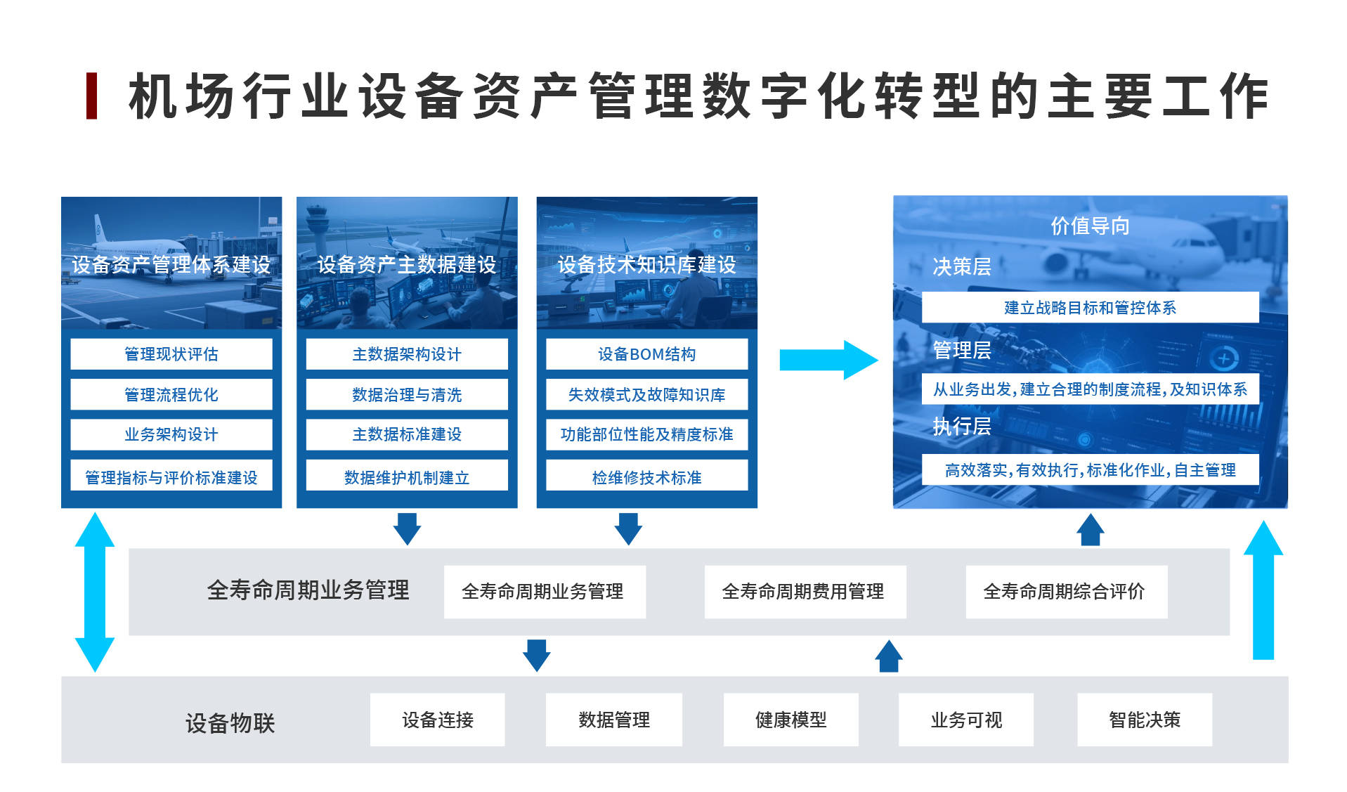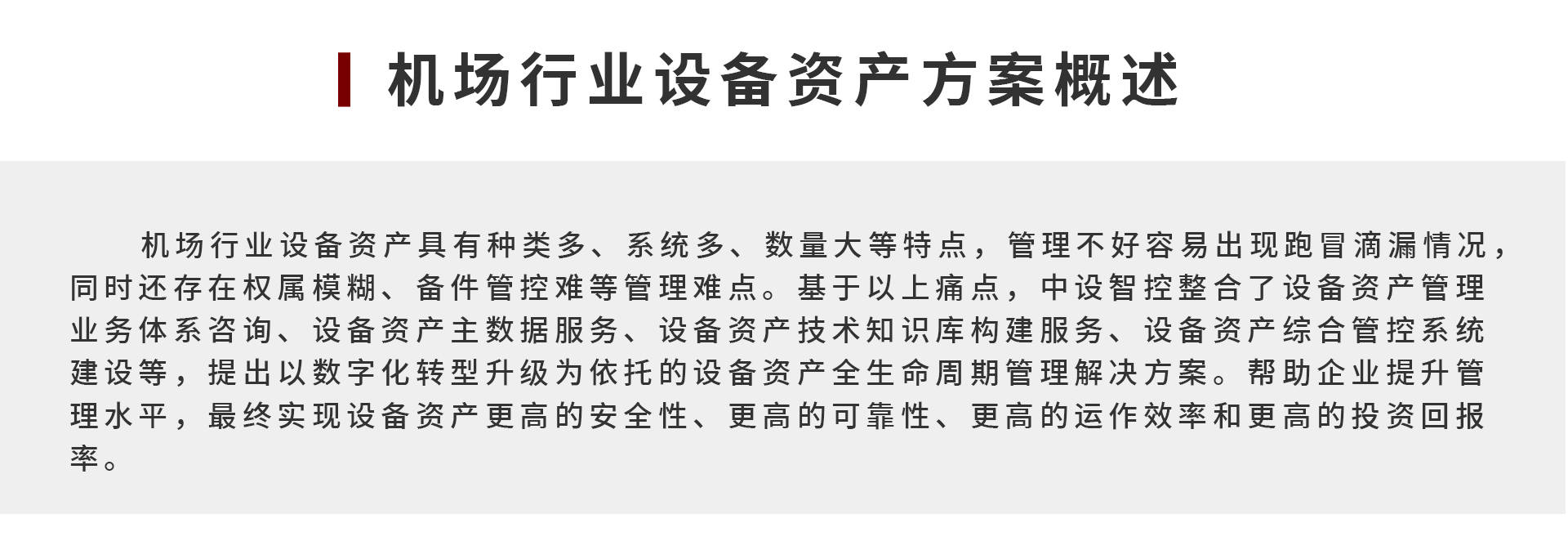 机场行业设备资产具有种类繁多、系统复杂、数量庞大等特性,管理不善易出现资产权属模糊、数据衔接困难、运维保障及备件管控复杂等难点,且安全监管与绩效评价也存在诸多挑战。基于这些痛点,中设智控整合设备资产管理业务体系、主数据建设、技术知识库搭建等服务,融合物联网、5G通信、云计算等技术,构建以数字化转型升级为依托的设备资产全生命周期管理解决方案。方案涵盖设备资产信息化管理、运维管理、备件管理、运行监控与数据分析及安全合规管理等功能模块,通过建立数据库编码体系、制定预防性维护计划、精准管控备件库存、实时监测设备状态,为管理决策提供全面数据支撑。该方案既能提升设备资产安全性、可靠性与运作效率,实现全生命周期高效管理,又凭借众多机场行业落地案例经验,助力机场企业优化管理成本、保障运营顺畅,有效应对设备管理困境,推动机场运营高质量发展 。