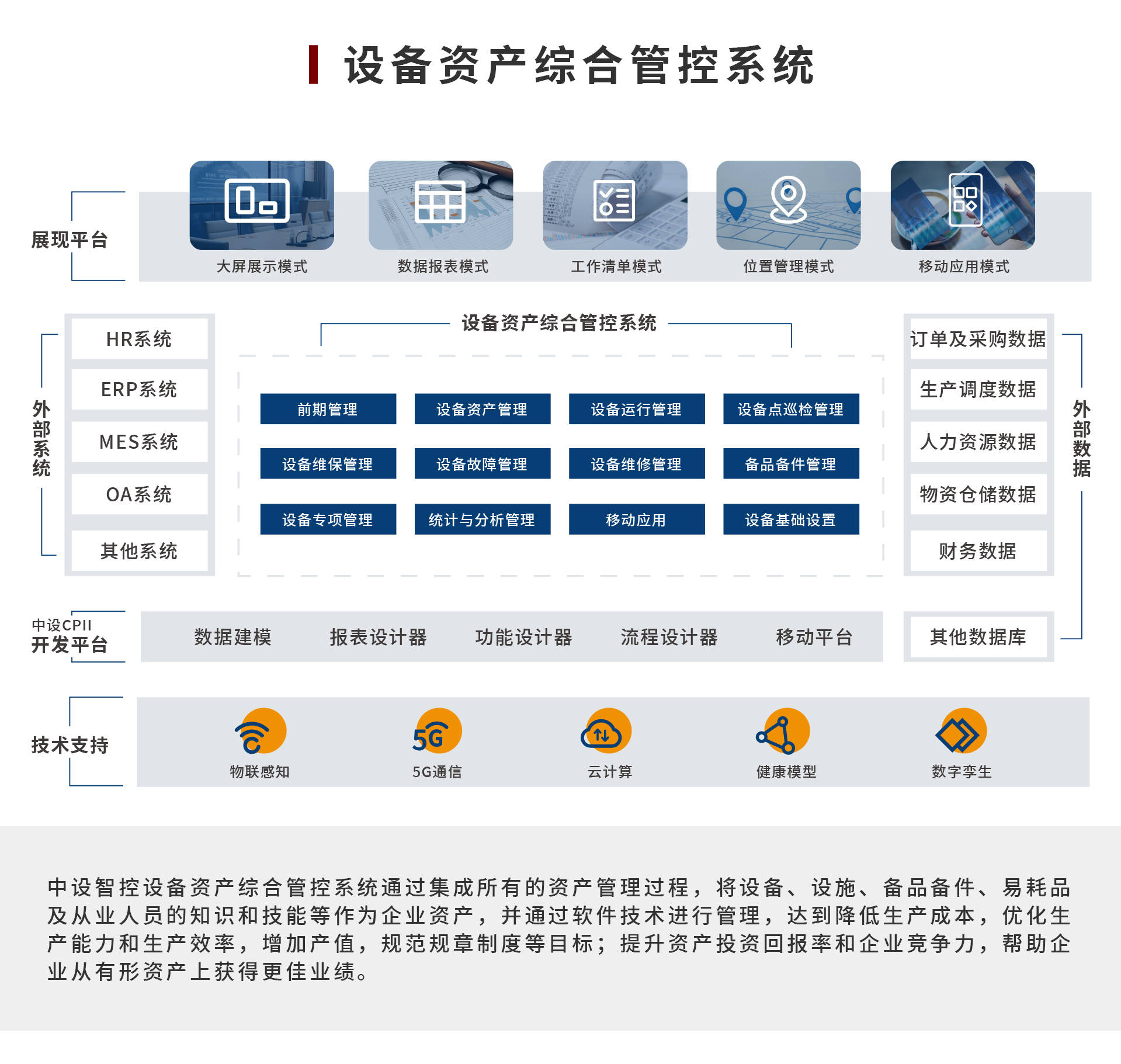 中设智控设备资产综合管控系统通过集成所有的资产管理过程,将设备、设施、备品备件、易耗品及从业人员的知识和技能等作为企业资产,并通过软件技术进行管理,达到降低生产成本,优化生产能力和生产效率,增加产值,规范规章制度等目标;提升资产投资回报率和企业竞争力,帮助企业从有形资产上获得更佳业绩。