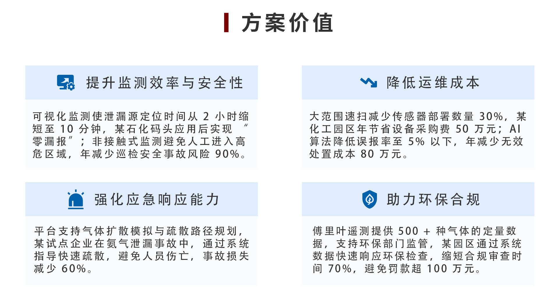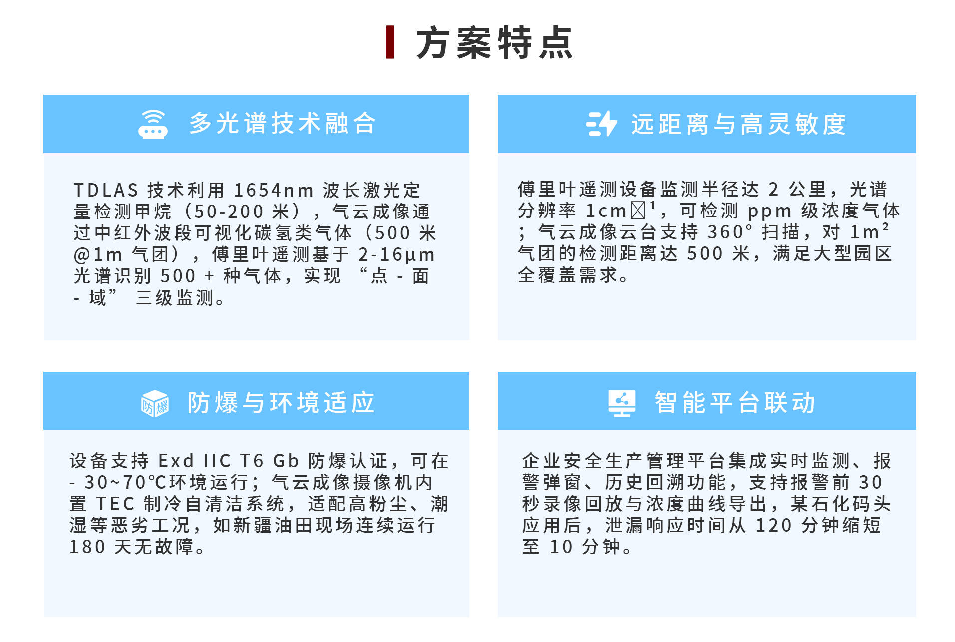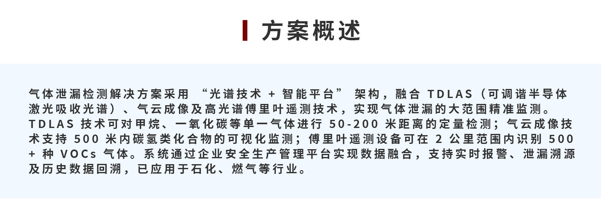 中设智控气体泄漏检测解决方案采用 “光谱技术 + 智能平台” 架构,融合 TDLAS(可调谐半导体激光吸收光谱)、气云成像及高光谱傅里叶遥测技术,实现气体泄漏的大范围精准监测。TDLAS 技术可对甲烷、一氧化碳等单一气体进行 50-200 米距离的定量检测;气云成像技术支持 500 米内碳氢类化合物的可视化监测;傅里叶遥测设备可在 2 公里范围内识别 500 + 种 VOCs 气体。系统通过企业安全生产管理平台实现数据融合,支持实时报警、泄漏溯源及历史数据回溯,已应用于石化、燃气等行业。