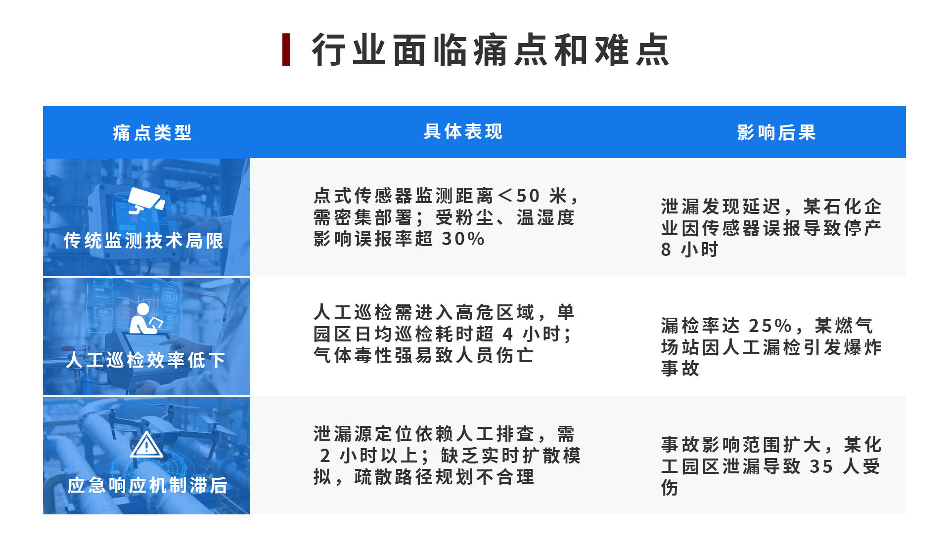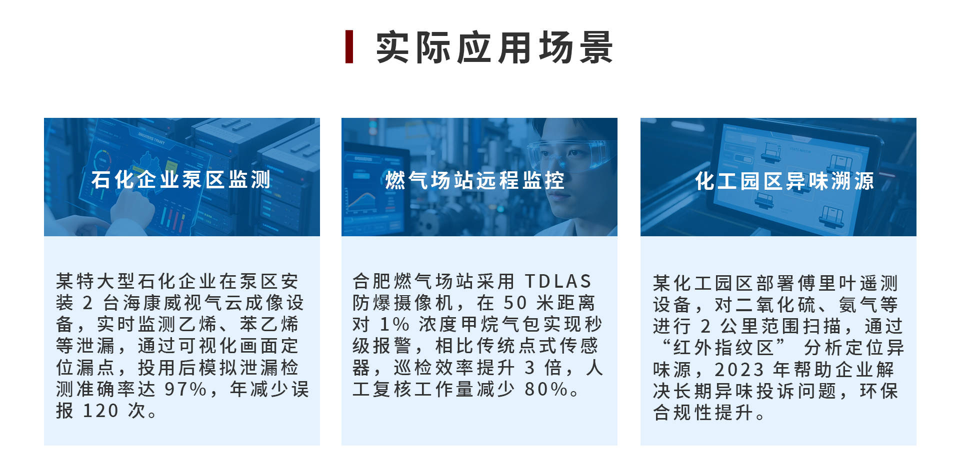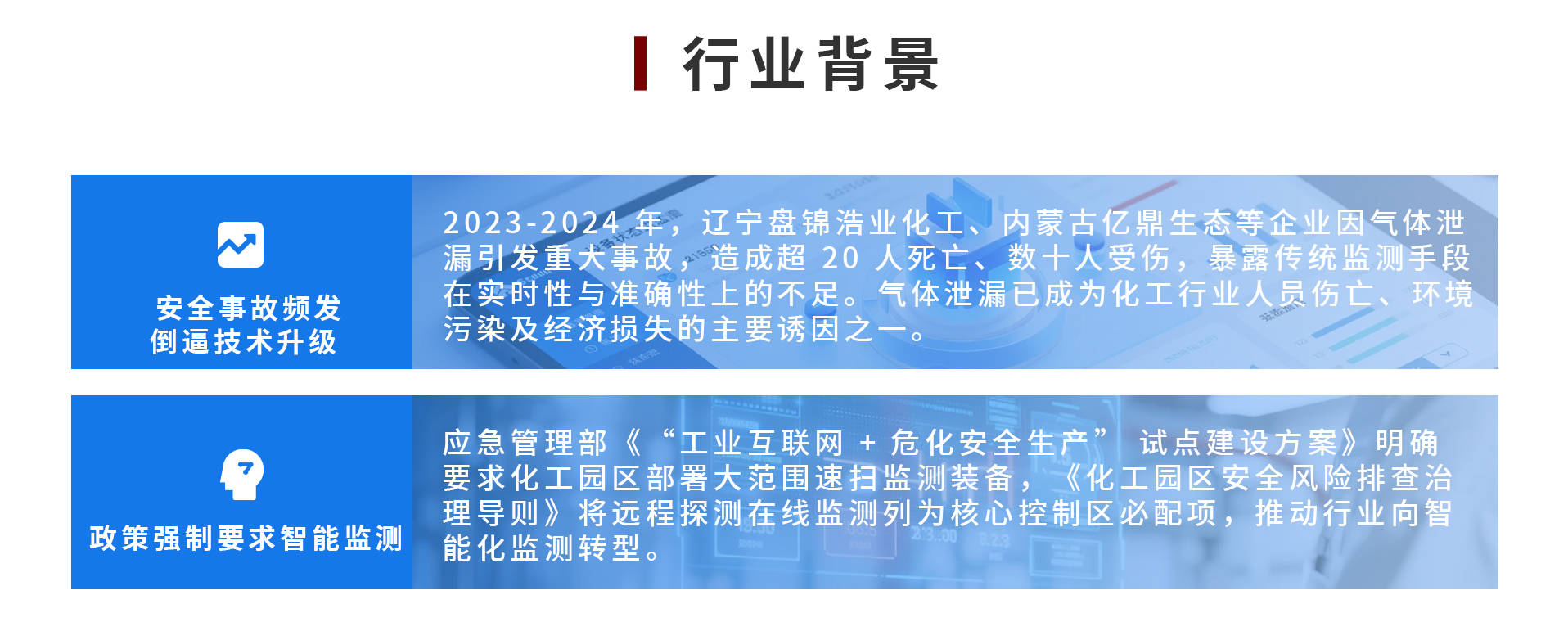 中设智控气体泄漏检测解决方案采用 “光谱技术 + 智能平台” 架构,融合 TDLAS(可调谐半导体激光吸收光谱)、气云成像及高光谱傅里叶遥测技术,实现气体泄漏的大范围精准监测。TDLAS 技术可对甲烷、一氧化碳等单一气体进行 50-200 米距离的定量检测;气云成像技术支持 500 米内碳氢类化合物的可视化监测;傅里叶遥测设备可在 2 公里范围内识别 500 + 种 VOCs 气体。系统通过企业安全生产管理平台实现数据融合,支持实时报警、泄漏溯源及历史数据回溯,已应用于石化、燃气等行业。