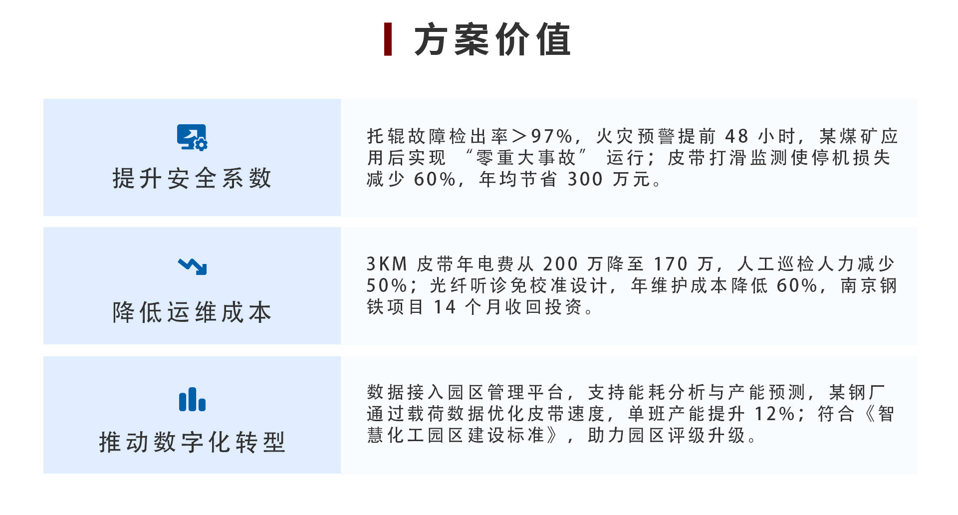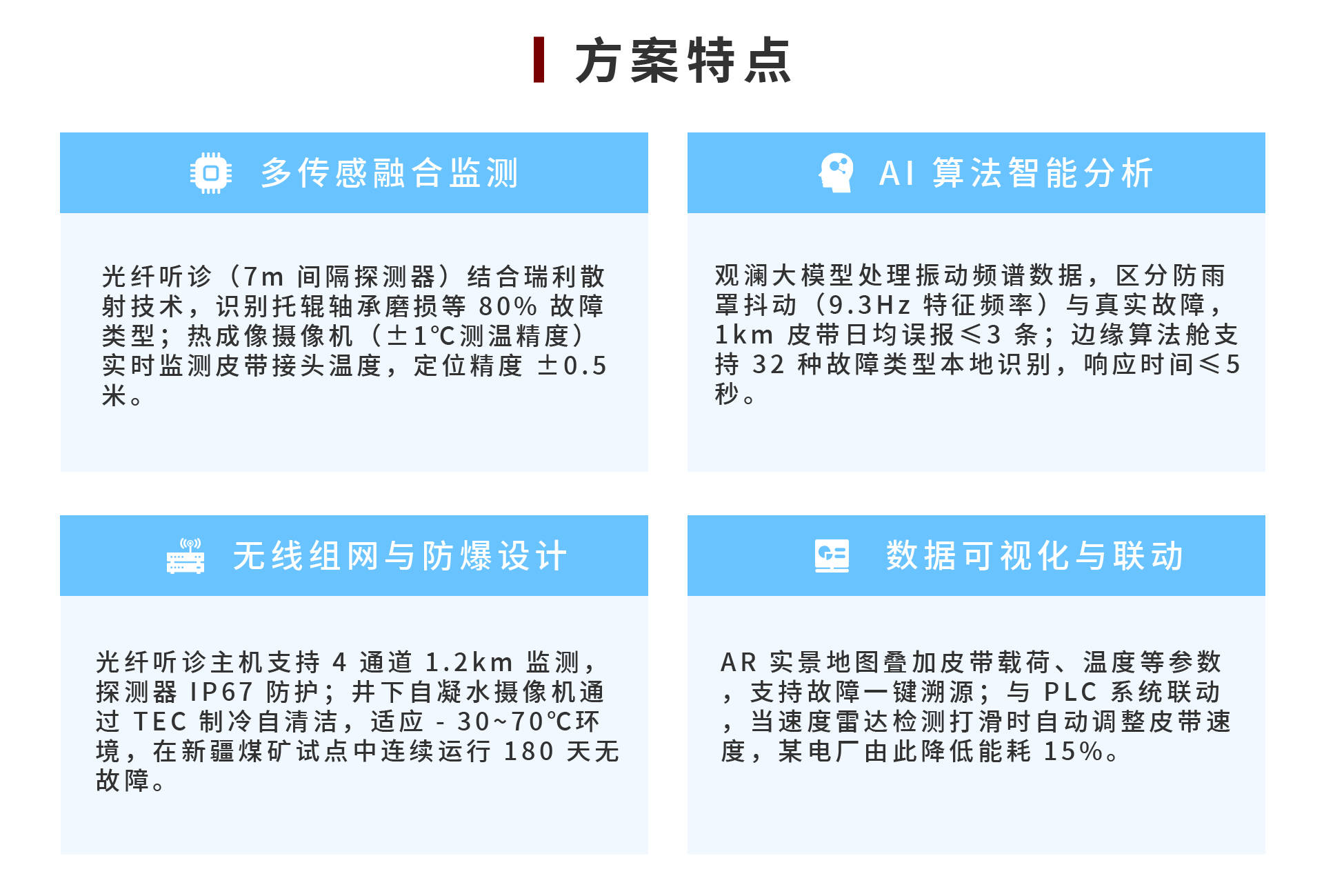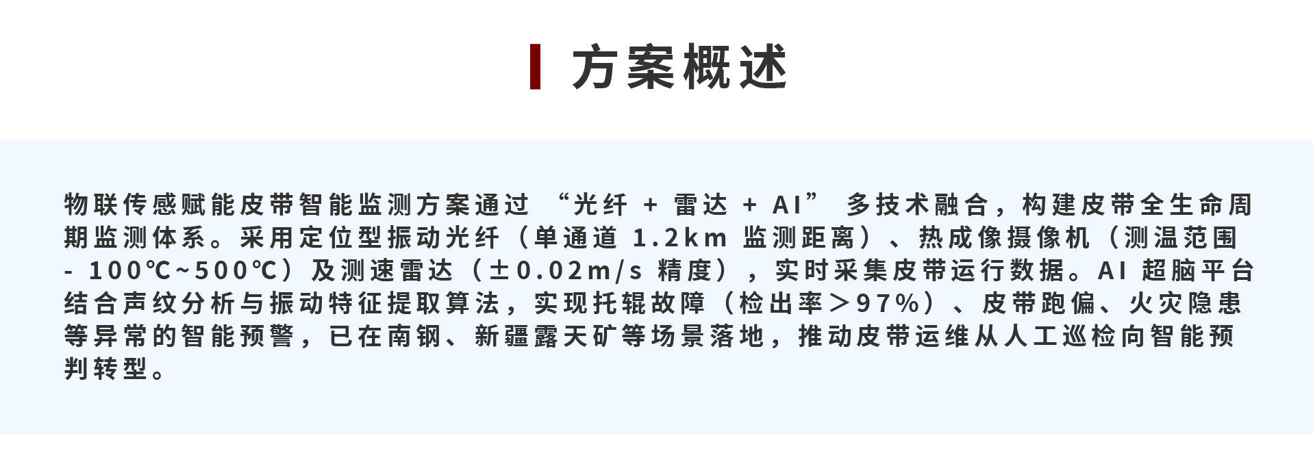 中设智控物联传感赋能皮带智能监测方案通过 “光纤 + 雷达 + AI” 多技术融合,构建皮带全生命周期监测体系。采用定位型振动光纤(单通道 1.2km 监测距离)、热成像摄像机(测温范围 - 100℃~500℃)及测速雷达(±0.02m/s 精度),实时采集皮带运行数据。AI 超脑平台结合声纹分析与振动特征提取算法,实现托辊故障(检出率>97%)、皮带跑偏、火灾隐患等异常的智能预警,已在南钢、新疆露天矿等场景落地,推动皮带运维从人工巡检向智能预判转型。