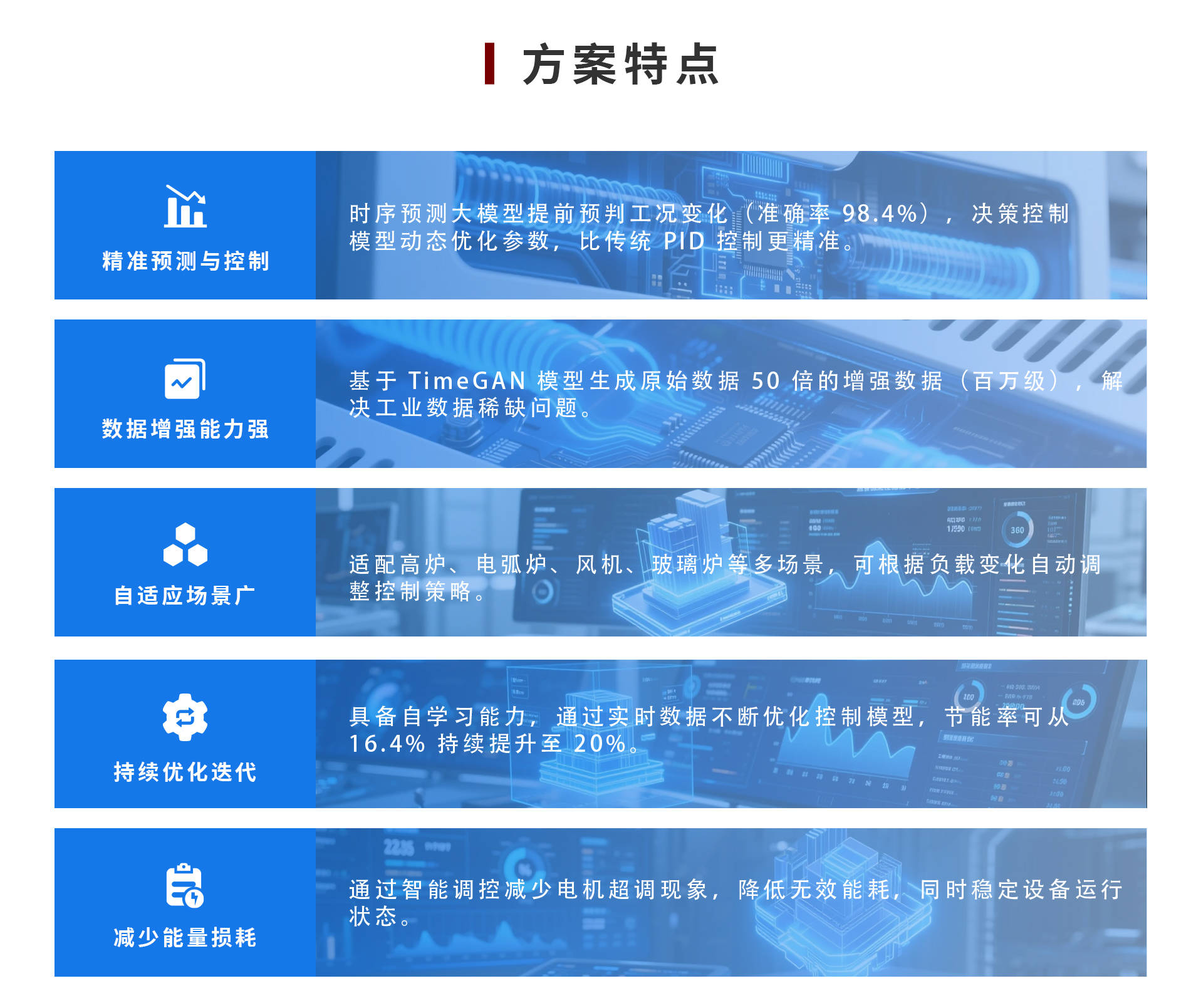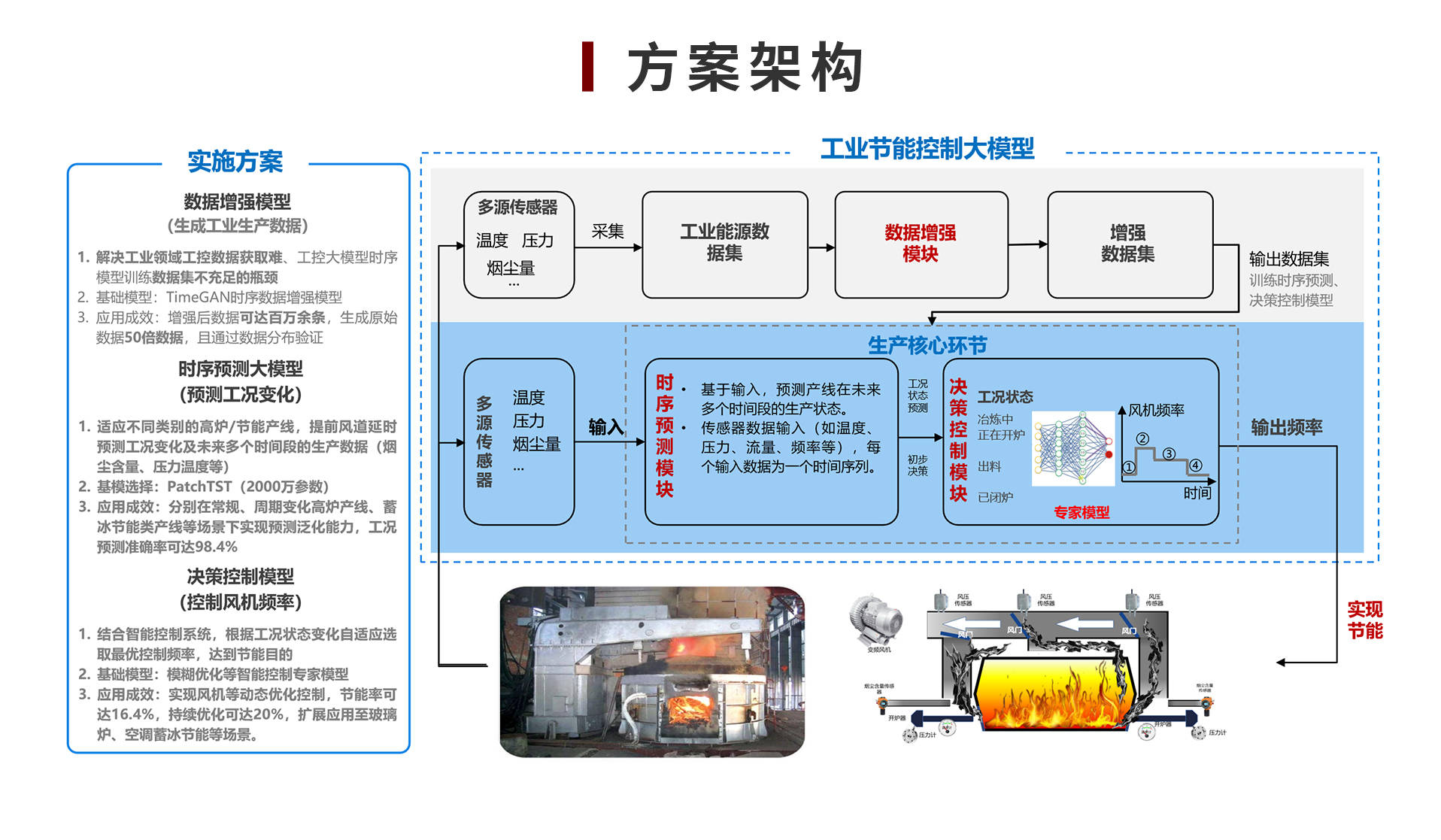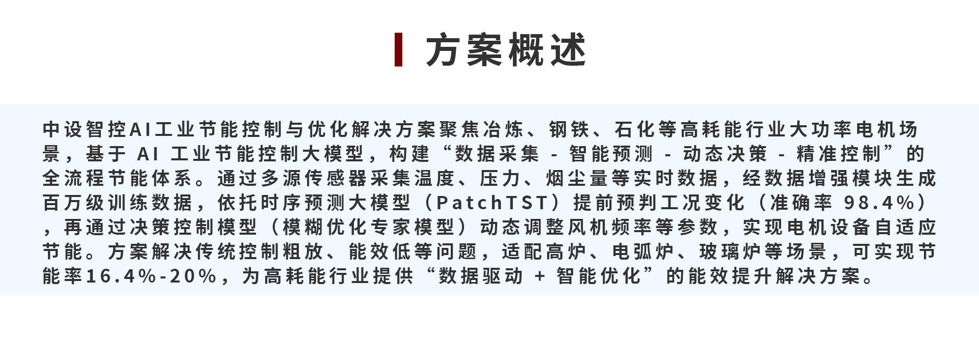 中设智控AI工业节能控制与优化解决方案聚焦冶炼、钢铁、石化等高耗能行业大功率电机场景,基于 AI 工业节能控制大模型,构建“数据采集 - 智能预测 - 动态决策 - 精准控制”的全流程节能体系。通过多源传感器采集温度、压力、烟尘量等实时数据,经数据增强模块生成百万级训练数据,依托时序预测大模型(PatchTST)提前预判工况变化(准确率 98.4%),再通过决策控制模型(模糊优化专家模型)动态调整风机频率等参数,实现电机设备自适应节能。方案解决传统控制粗放、能效低等问题,适配高炉、电弧炉、玻璃炉等场景,可实现节能率16.4%-20%,为高耗能行业提供“数据驱动 + 智能优化”的能效提升解决方案。