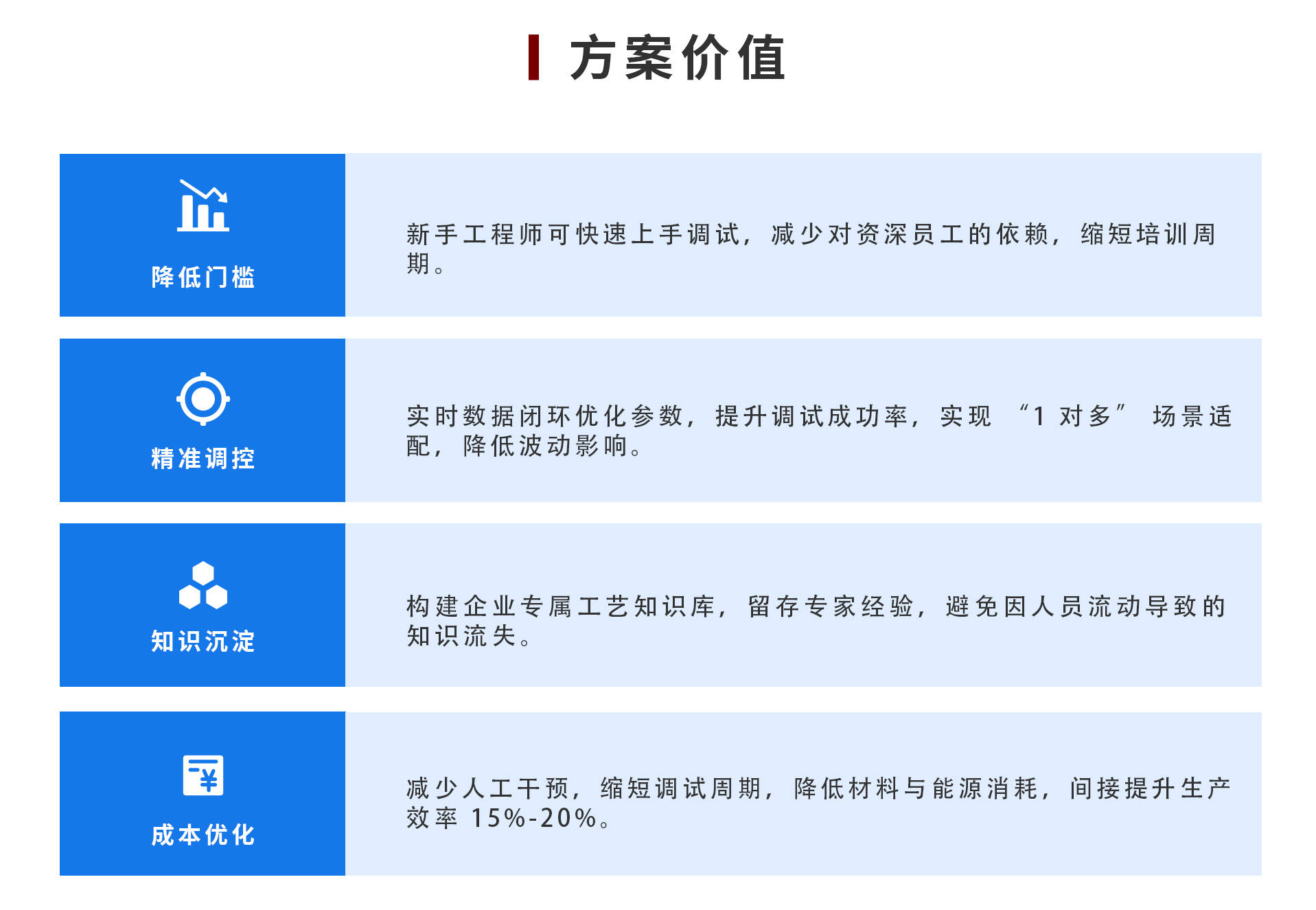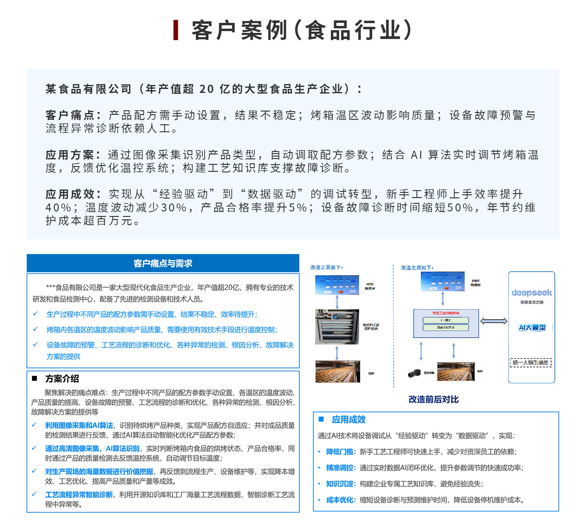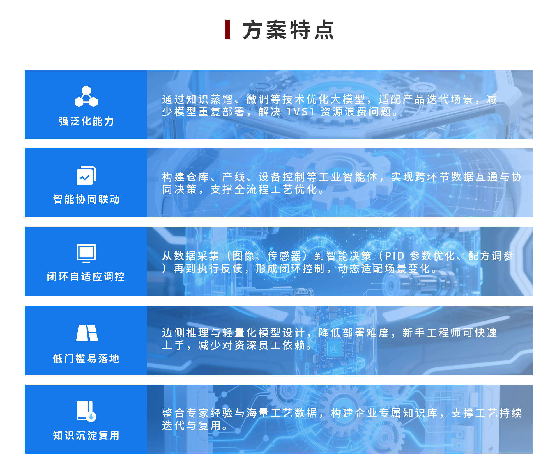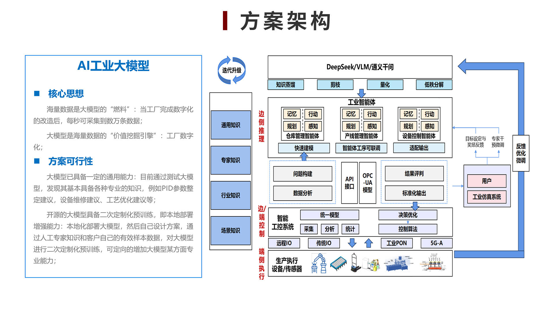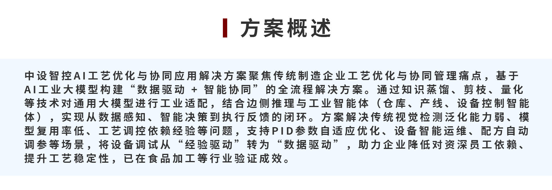 中设智控AI工艺优化与协同应用解决方案聚焦传统制造企业工艺优化与协同管理痛点,基于AI工业大模型构建“数据驱动 + 智能协同”的全流程解决方案。通过知识蒸馏、剪枝、量化等技术对通用大模型进行工业适配,结合边侧推理与工业智能体(仓库、产线、设备控制智能体),实现从数据感知、智能决策到执行反馈的闭环。方案解决传统视觉检测泛化能力弱、模型复用率低、工艺调控依赖经验等问题,支持PID参数自适应优化、设备智能运维、配方自动调参等场景,将设备调试从“经验驱动”转为“数据驱动”,助力企业降低对资深员工依赖、提升工艺稳定性,已在食品加工等行业验证成效。