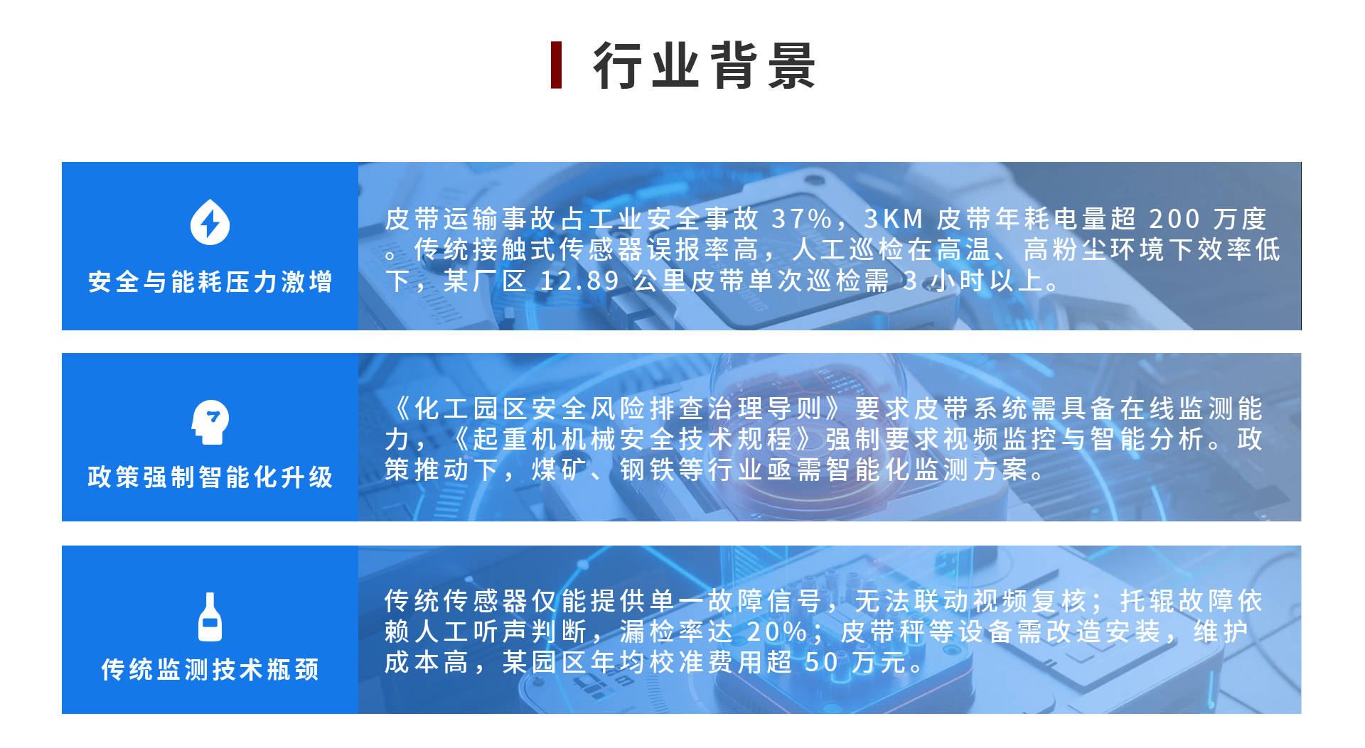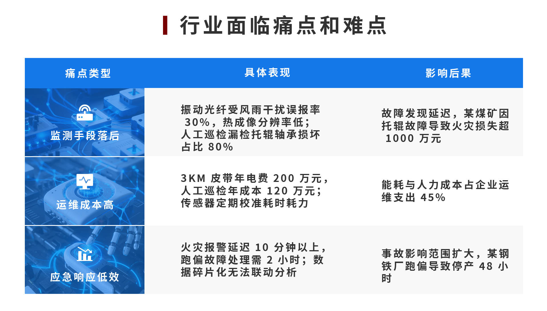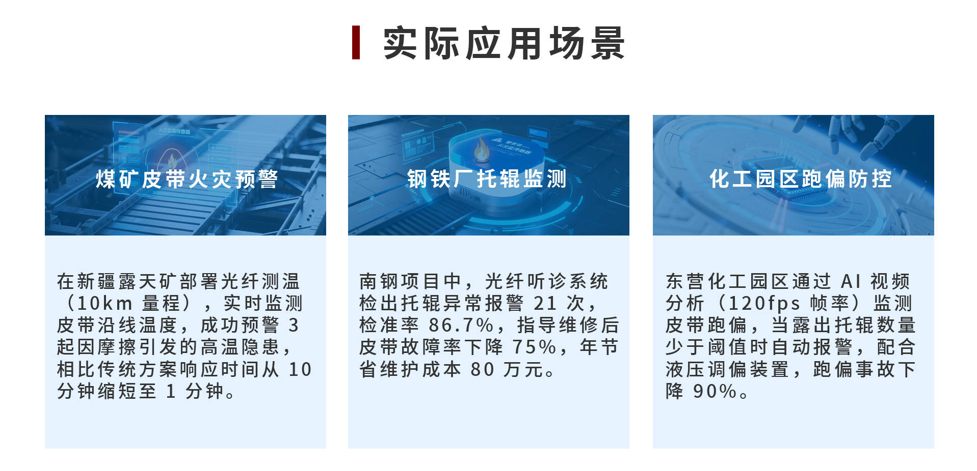 中设智控物联传感赋能皮带智能监测方案通过 “光纤 + 雷达 + AI” 多技术融合,构建皮带全生命周期监测体系。采用定位型振动光纤(单通道 1.2km 监测距离)、热成像摄像机(测温范围 - 100℃~500℃)及测速雷达(±0.02m/s 精度),实时采集皮带运行数据。AI 超脑平台结合声纹分析与振动特征提取算法,实现托辊故障(检出率>97%)、皮带跑偏、火灾隐患等异常的智能预警,已在南钢、新疆露天矿等场景落地,推动皮带运维从人工巡检向智能预判转型。