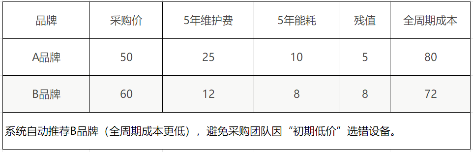 品牌采购价5年维护费5年能耗残值全周期成本A品牌502510580B品牌60128872系统自动推荐B品牌(全周期成本更低),避免采购团队因“初期低价”选错设备。