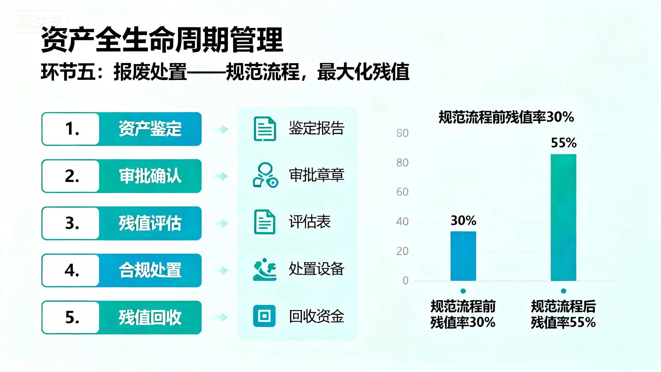 - 发起报废申请需上传“检测报告、残值评估表”,经设备部(确认无法使用)、财务部(核算残值)、管理层多级审批;处置时需选择“有资质的回收商”(系统记录回收商资质备案),避免环保违规。
