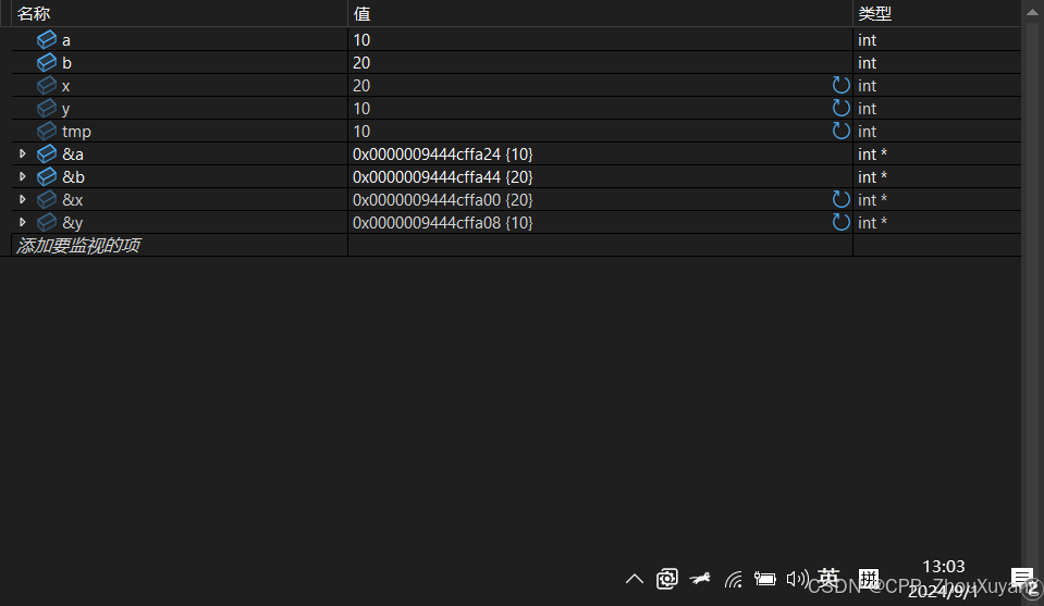 监视告诉我们形参xy和实参ab各有各的地址。虽然x和y确实交换了,但x和y是形参,并不会影响a和b,所以a和b没有任何变化。