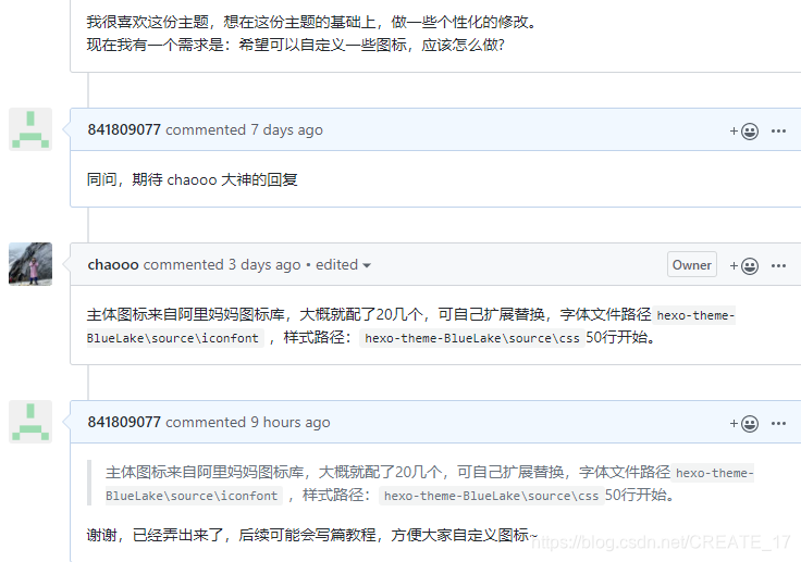 然后我就去了主题作者 chaooo 的 github 上留言,咨询其方法,作者回复的很快,按照作者的回复,成功将自定义图标制作出来了,也分享给有需要的人。