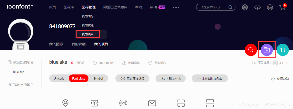 首先通过 github 或 新浪微博 账号登录 阿里妈妈图标库;然后,点击 图标管理 -> 我的项目 -> 新建项目,如下图所示: