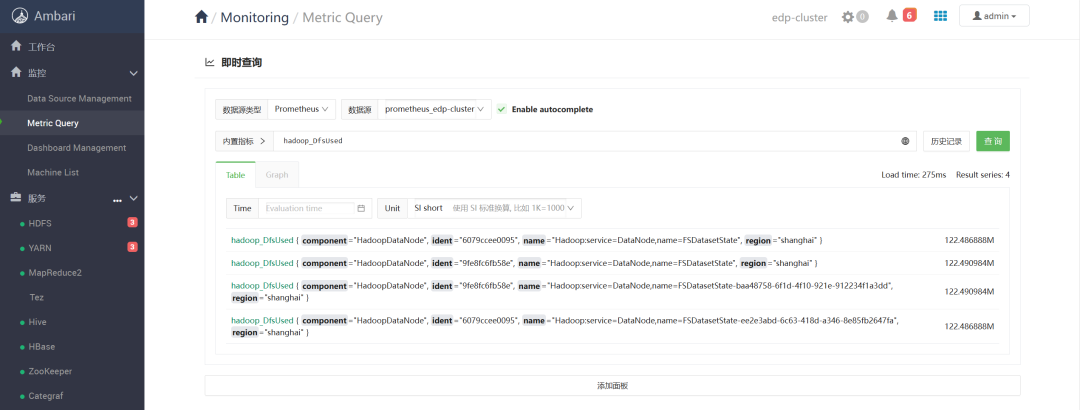 在 Ambari EDP 中,增加了监控数据源配置管理。EDP 支持很多数据源,只要是 Prometheus 兼容的数据库都可以,所以就需要这个管理界面了。